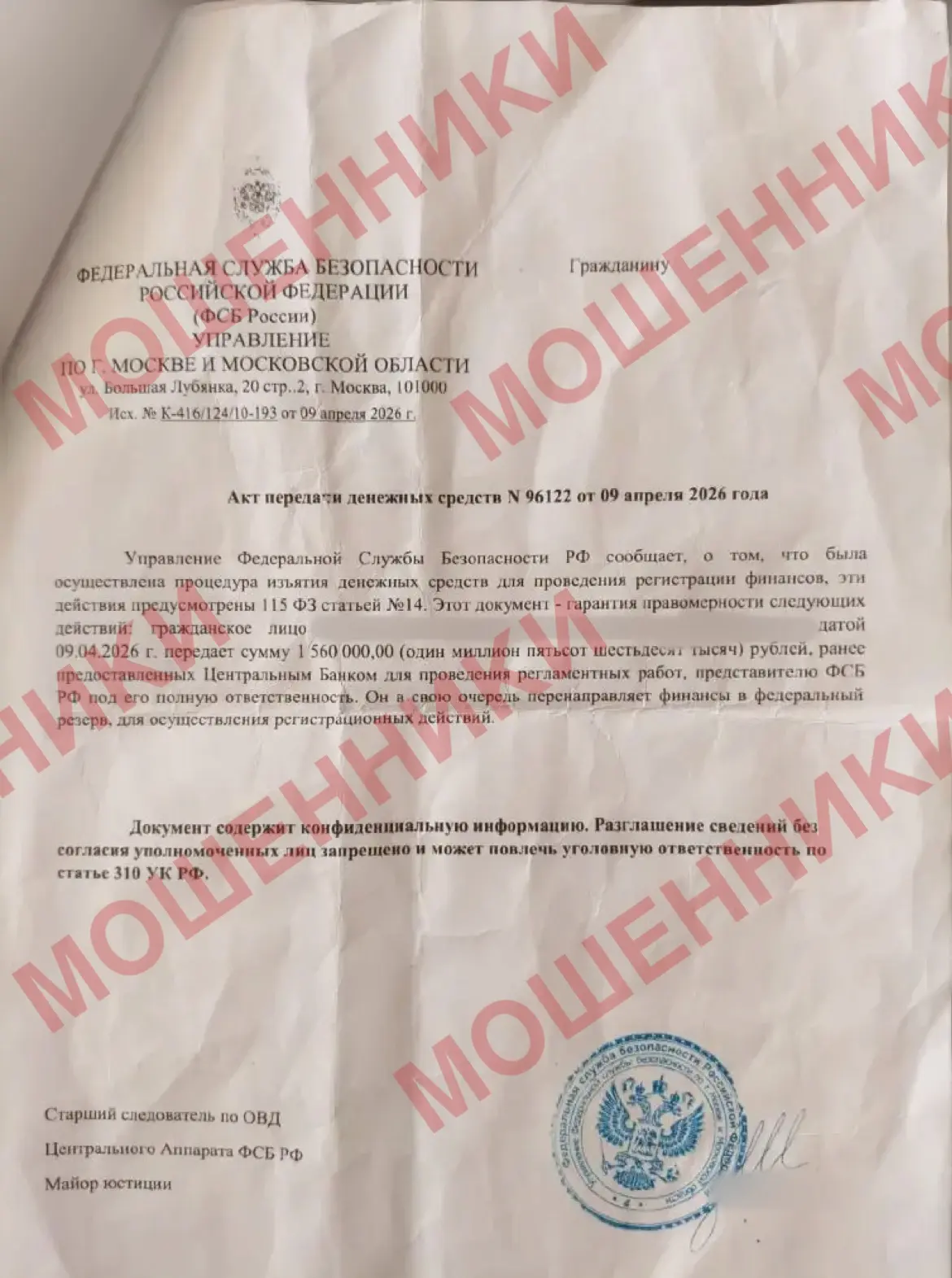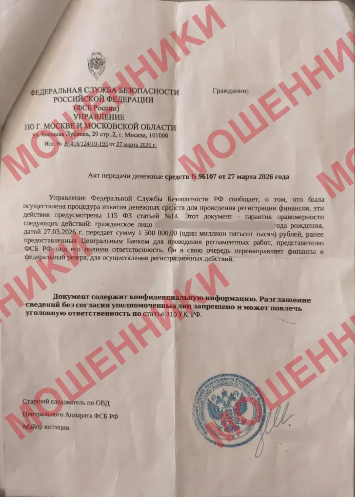 Вот такие фейковые документы вручили курьеры аферистов жителю Якутска 1941 года рождения, когда он передал им свои сбережения в Москве и Санкт-Петербурге