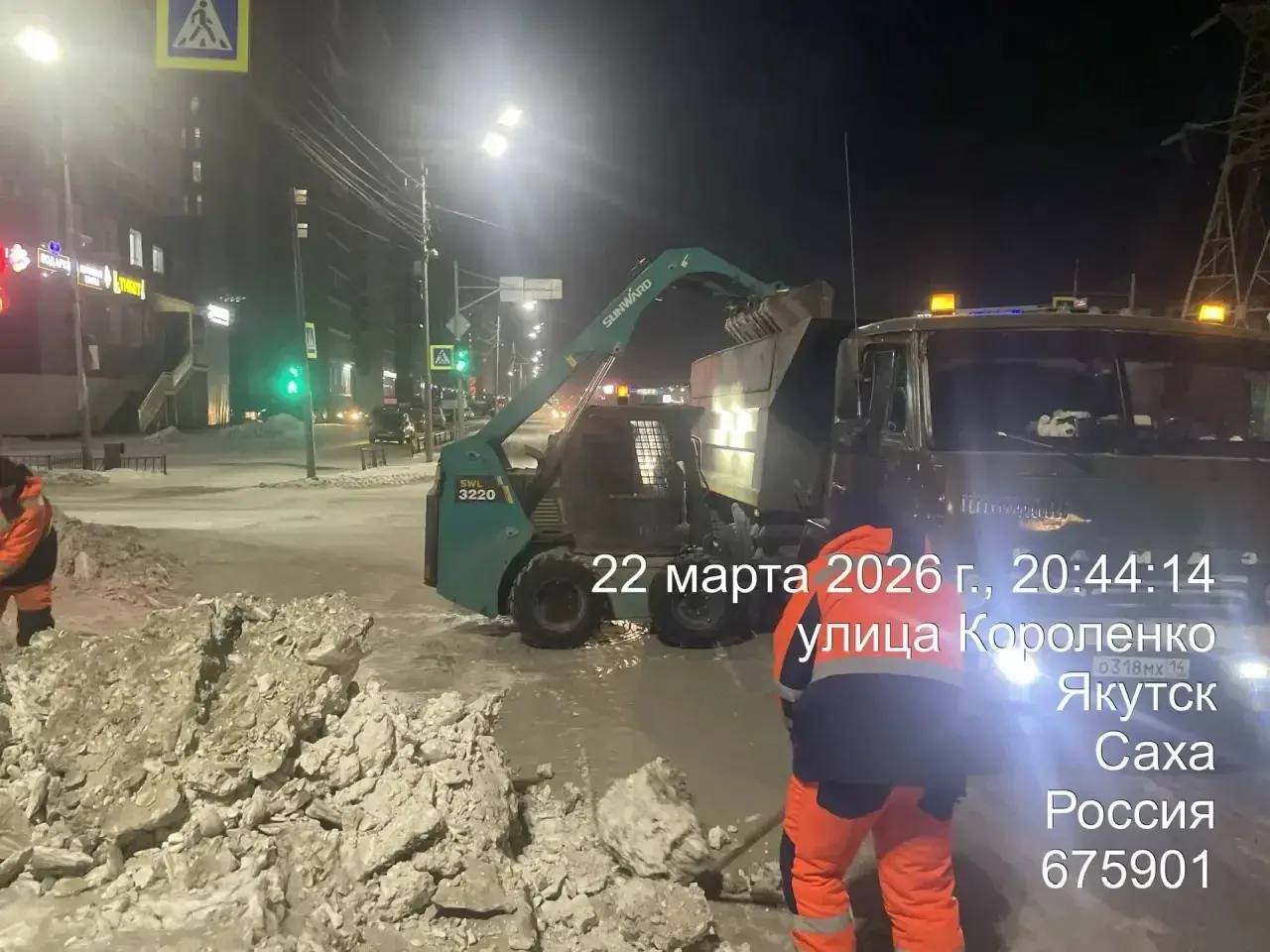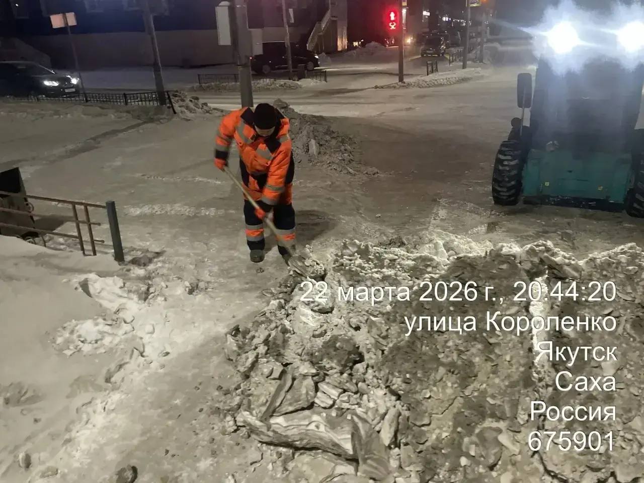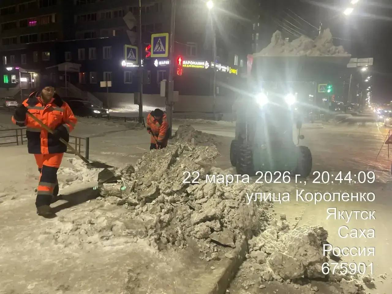 Кадры ночных работ по уборке снега по ул. Короленко.