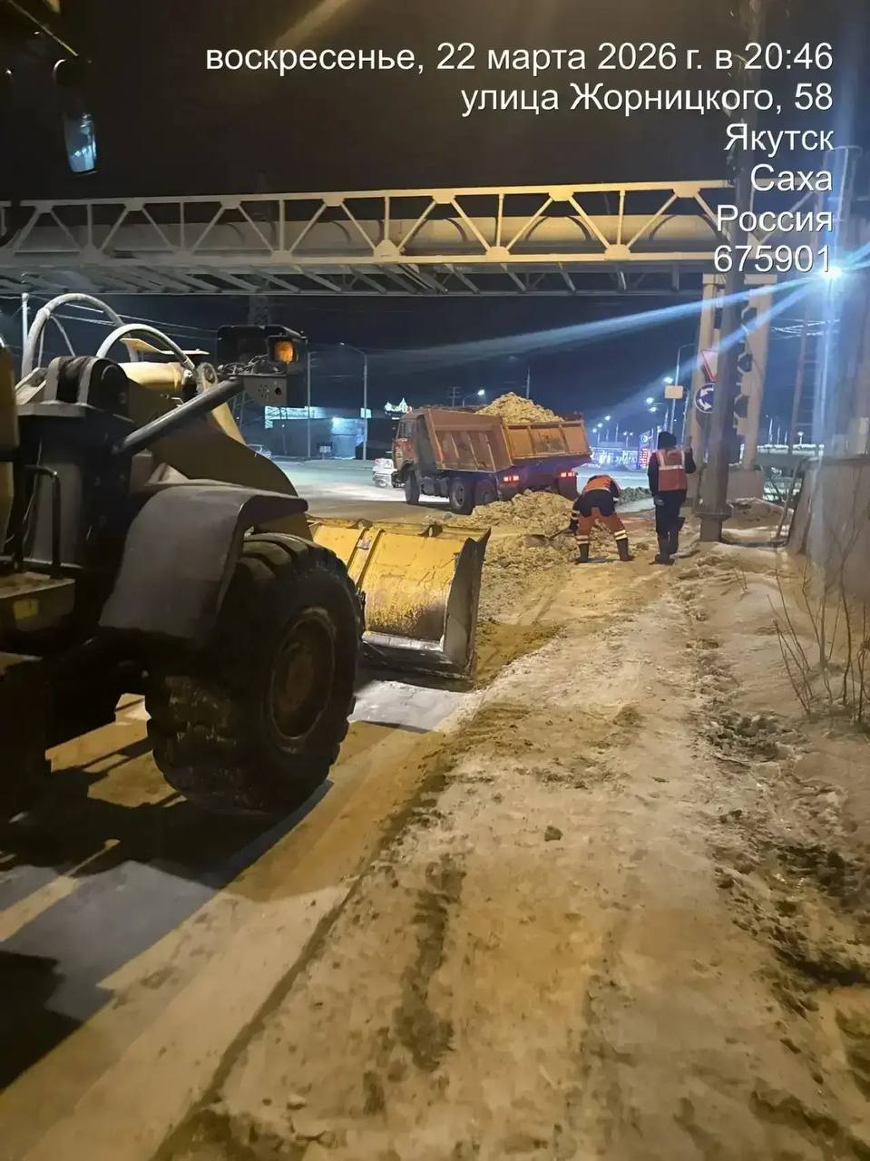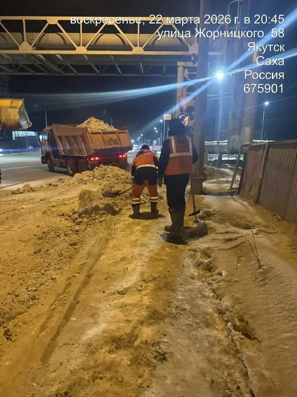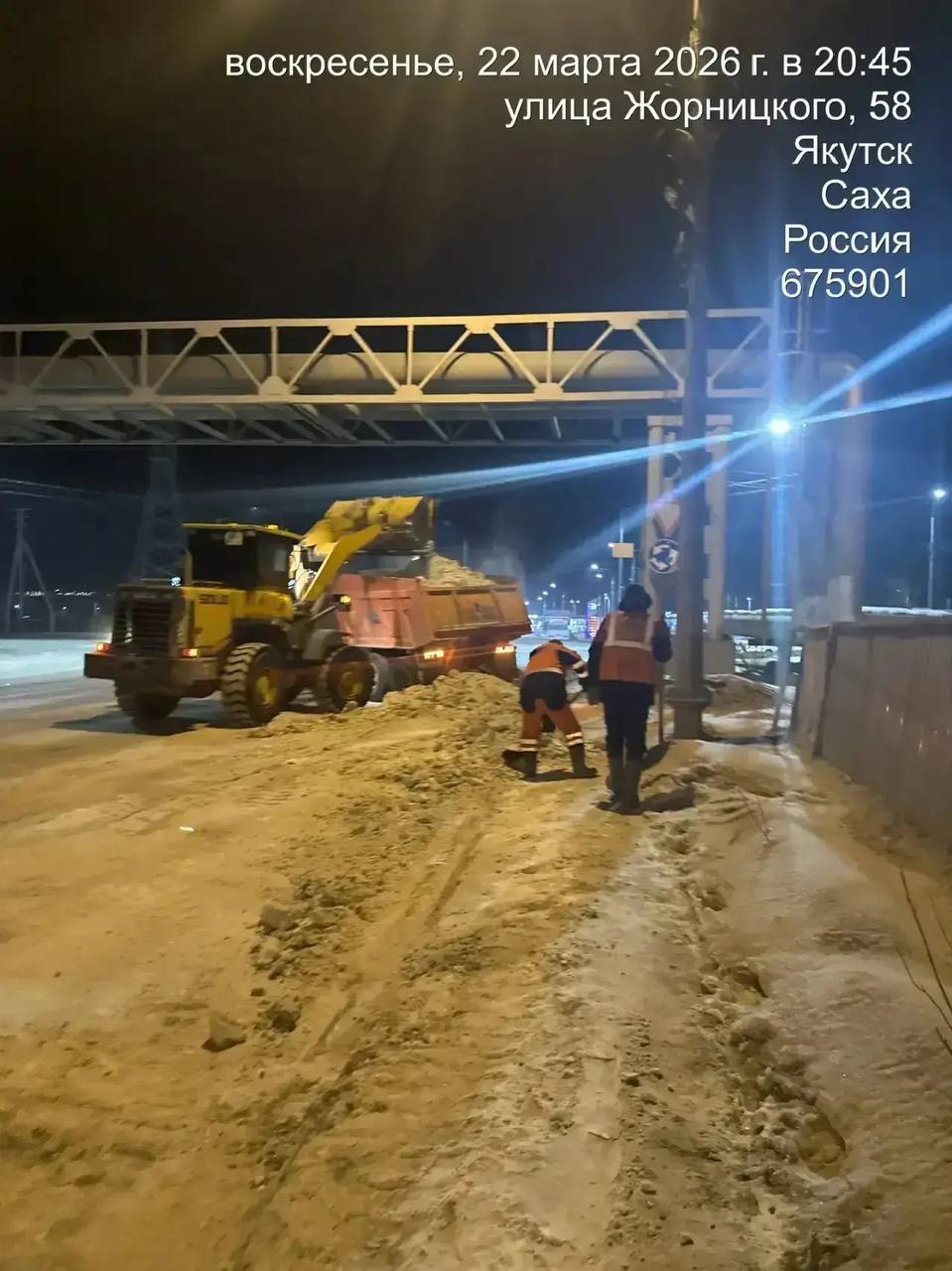 Кадры ночных работ по уборке снега по ул. Жорницкого.