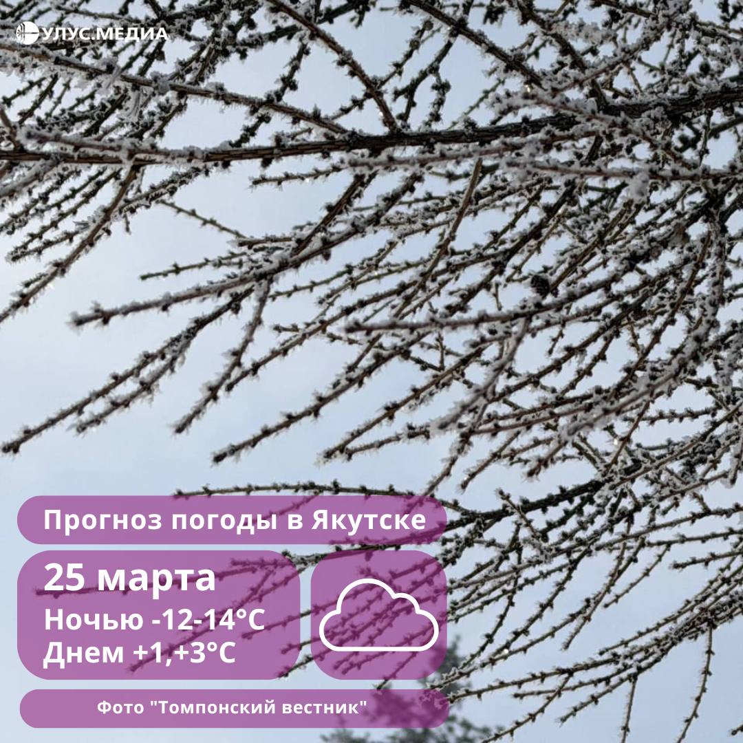 В Якутске 25 марта существенных осадков не предвидится. В столице ожидается слабый юго-западный ветер со скоростью 2–5 м/с. Температура воздуха в ночные часы составит около -12…-14 градусов, а днем поднимется до +1…+3 градусов.