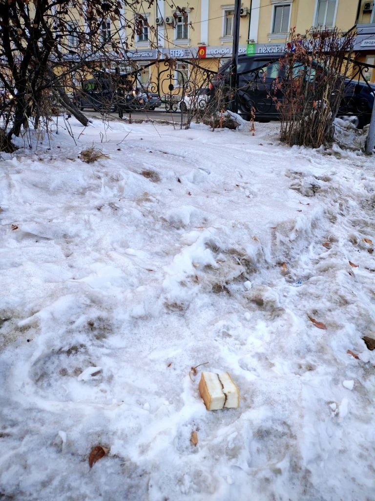 Необычная находка на пл. Орджоникидзе - здоровый кусок сала. Откуда он здесь взялся, непонятно.