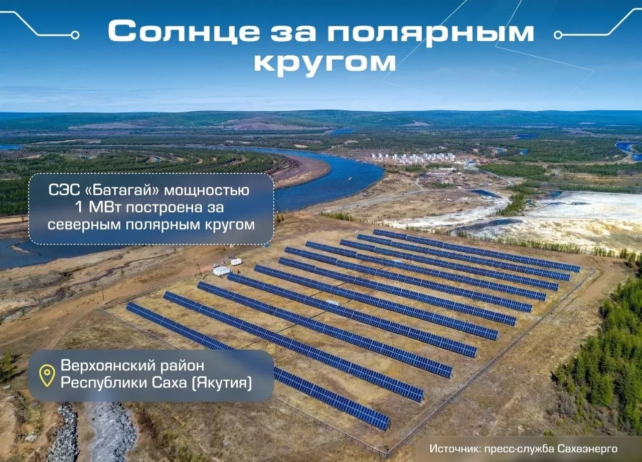 Благодаря континентальному климату и ясной погоде Якутия входит в десятку самых солнечных регионов России. На сегодня в рамках развития возобновляемой генерации энергетики уже возвели 31 солнечную электростанцию. Одна из них, СЭС «Батагай», в 2015 году попала в Книгу рекордов Гиннесса как самая северная в мире солнечная электростанция.