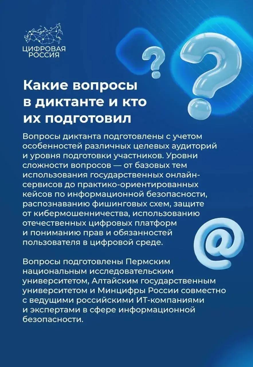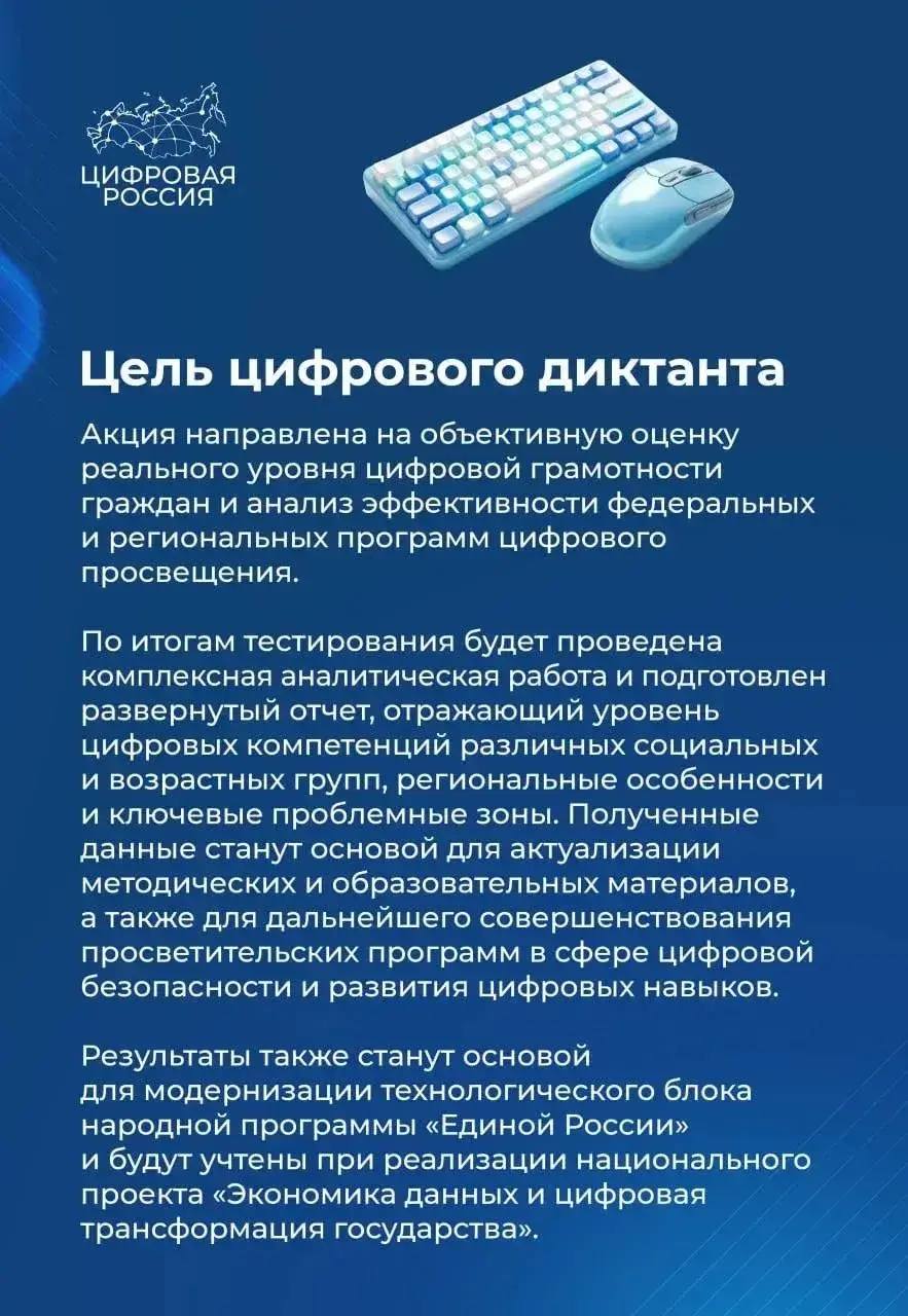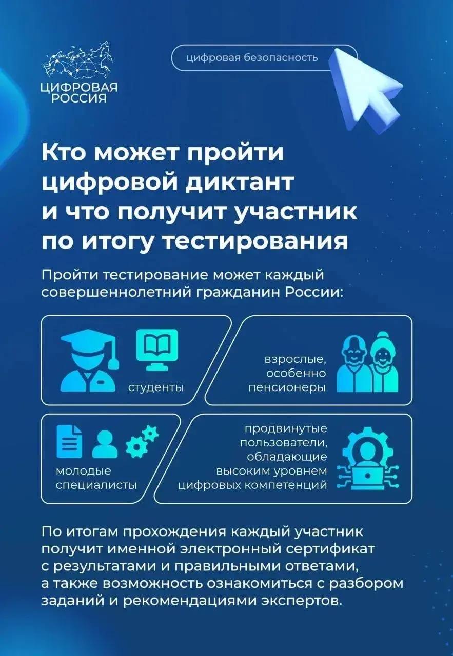 В рамках акции участники смогут пройти онлайн-тестирование, которое охватывает ключевые аспекты цифровой грамотности: основы работы с цифровыми технологиями, кибербезопасность, цифровые сервисы и навыки работы в интернете. Пройти диктант можно бесплатно на официальном сайте проекта в любое удобное время в течение недели.