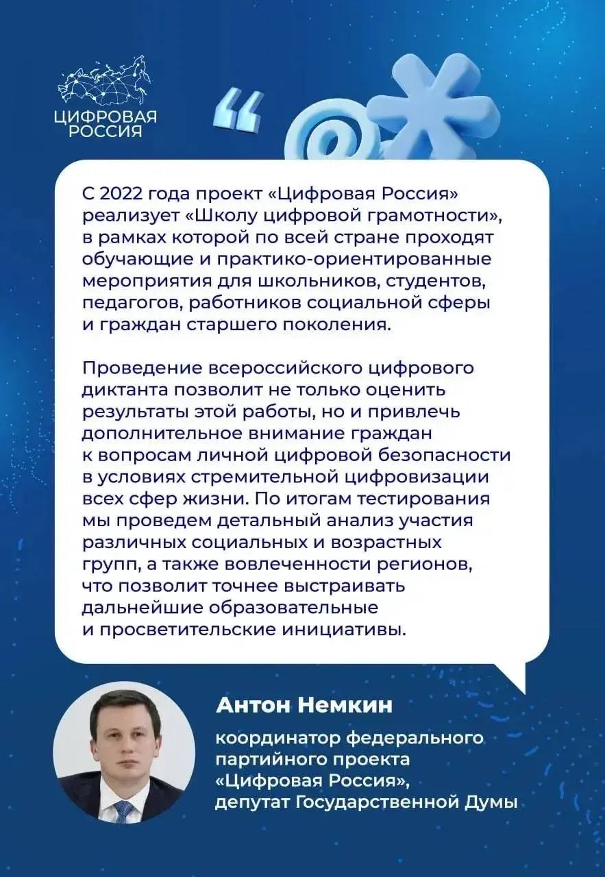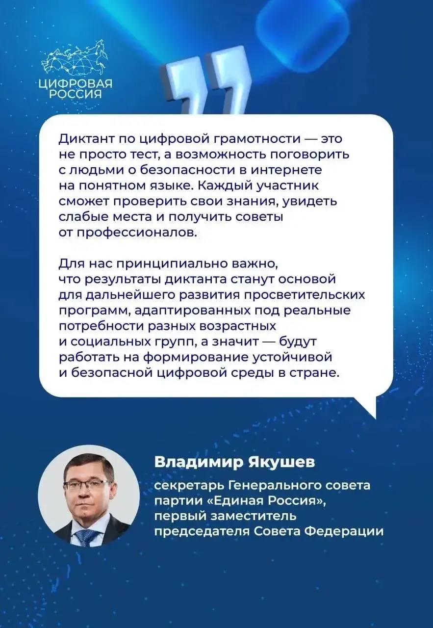 «Цифровая грамотность сегодня — это базовый навык, необходимый каждому человеку. Такие инициативы, как «Цифровой диктант», помогают не только оценить текущий уровень знаний, но и стимулируют интерес к развитию цифровых компетенций. Для Якутии, с учетом масштабной цифровой трансформации и развития удаленных территорий, это особенно важно. Мы призываем жителей республики активно присоединиться к акции и проверить свои знания», — отметил министр инноваций, цифрового развития и информационных технологий Якутии Петр Николаев.