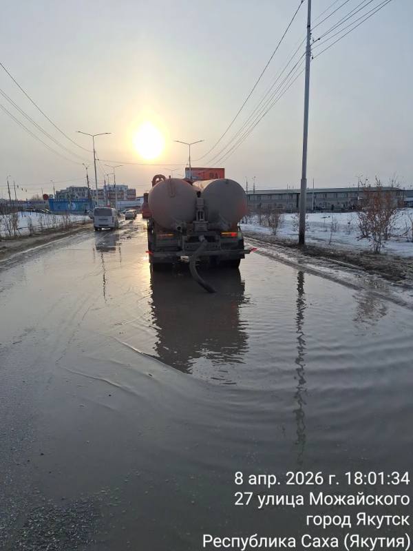 По состоянию на 8 апреля 2026 года в Якутске за день было откачано свыше 1000 кубометров талых вод. Для выполнения этой задачи задействованы 11 ассенизаторских машин МУП «Жилкомсервис».