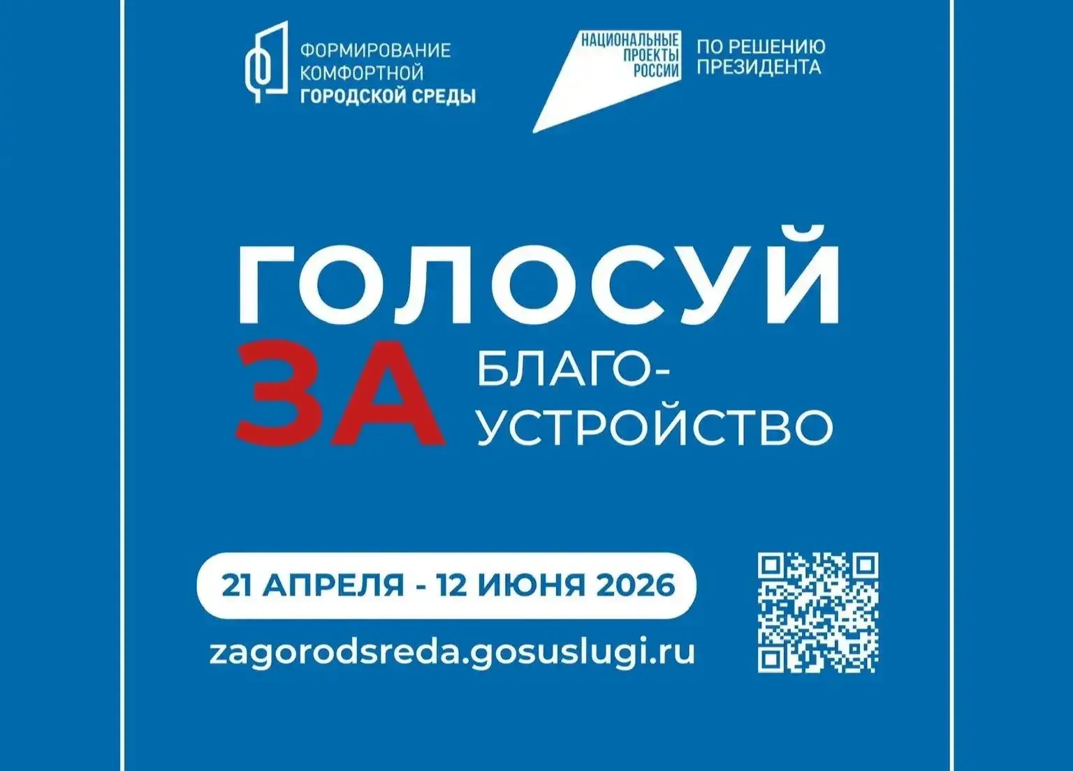 С 21 апреля по 12 июня на портале zagorodsreda.gosuslugi.ru пройдёт всероссийское голосование за благоустройство территорий в рамках федерального проекта «Формирование комфортной городской среды» национального проекта «Инфраструктура для жизни», инициированного Президентом Российской Федерации Владимиром Путиным. В основе программы лежит партийный проект «Единой России» «Городская среда», а реализация ФКГС является одним из ключевых положений народной программы партии.