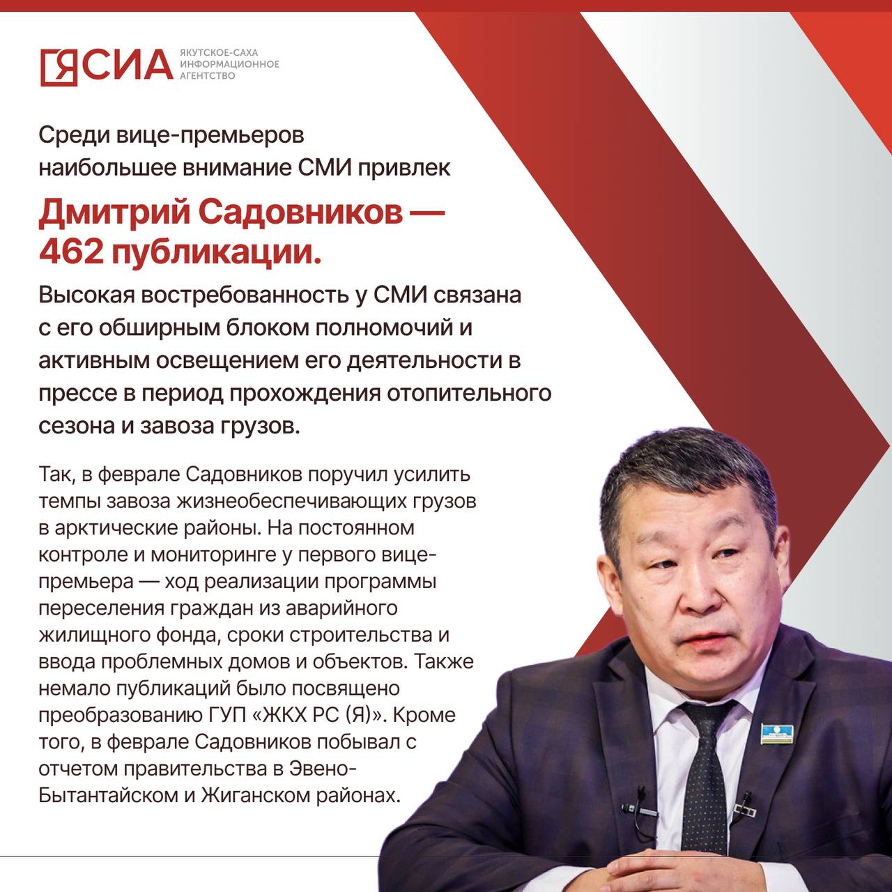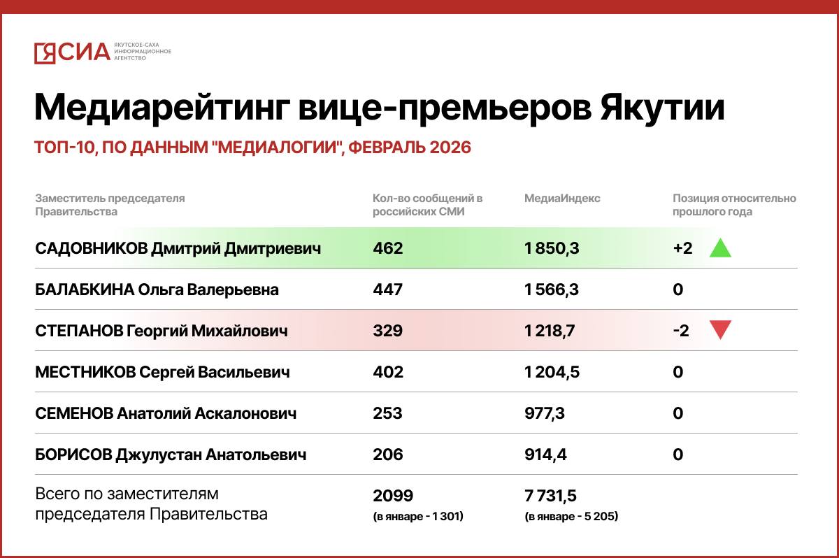 Медиалогия составила медиарейтинг региональных вице-премьеров по итогам февраля 2026 года. Лидером среди коллег стал первый зампред Дмитрий Садовников.