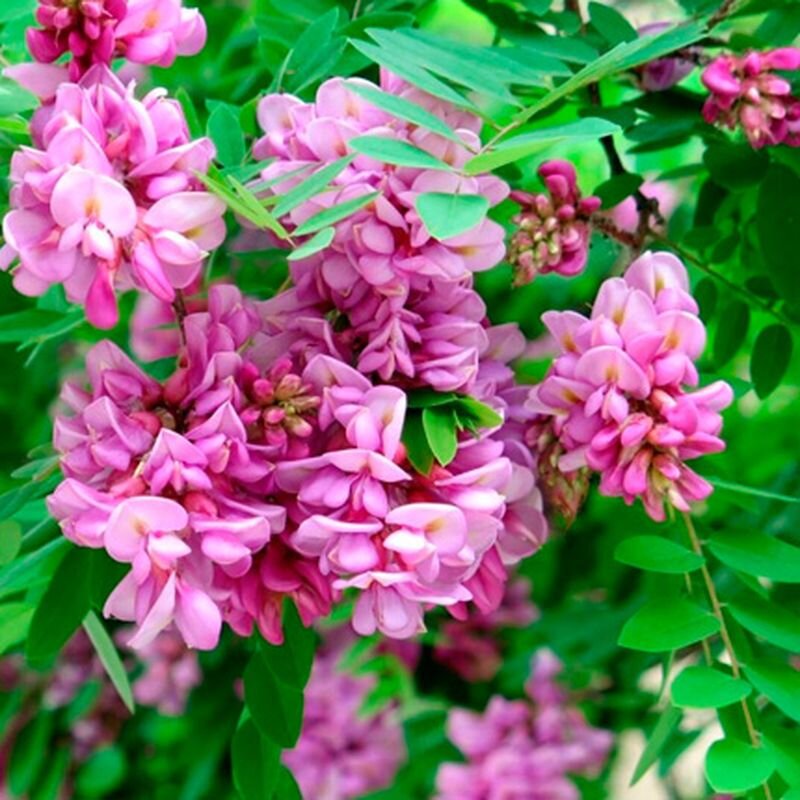 Это растение происходит из Северной Америки и принадлежит к семейству бобовых. В молодом возрасте робиния клейкая может достигать высоты от 5 до 12 метров и легко формирует эффектную раскидистую крону. Цветки робинии довольно крупные и располагаются в плотных соцветиях башмачкового цвета, способных поразить своей красотой. Цветение начинается с начала лета и продолжается практически до ноября, что делает это дерево настоящим украшением сада.
