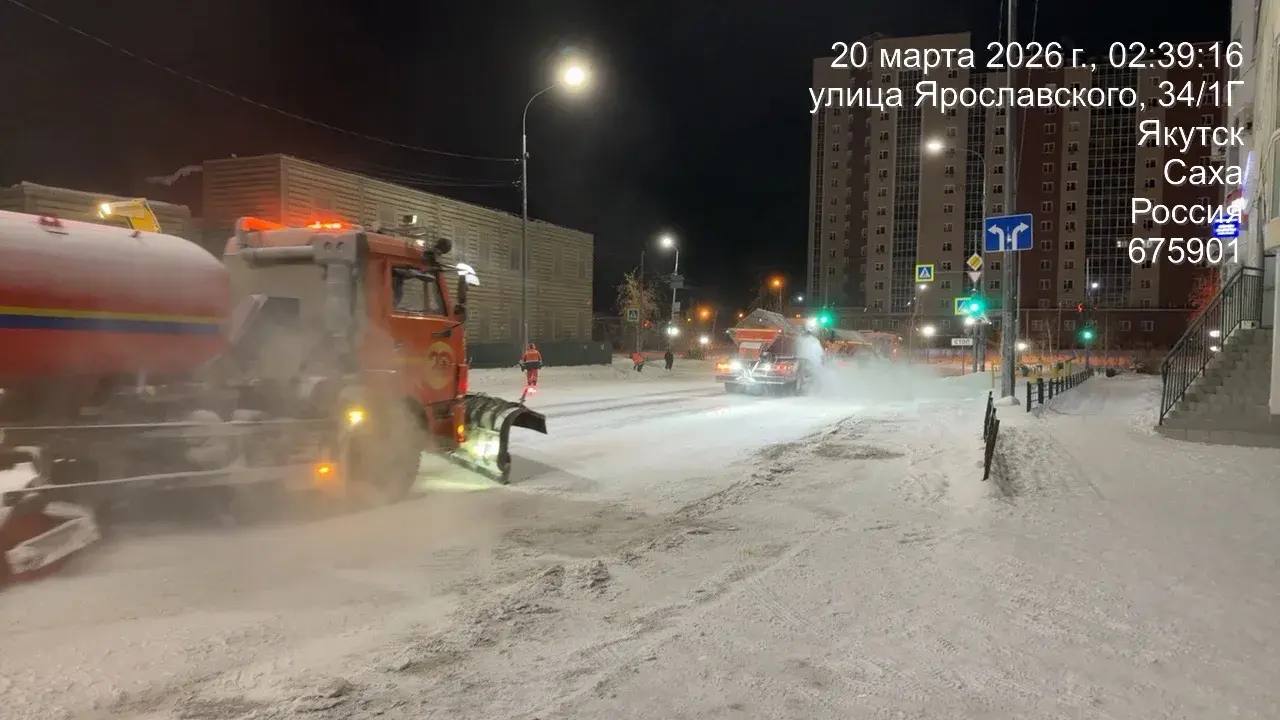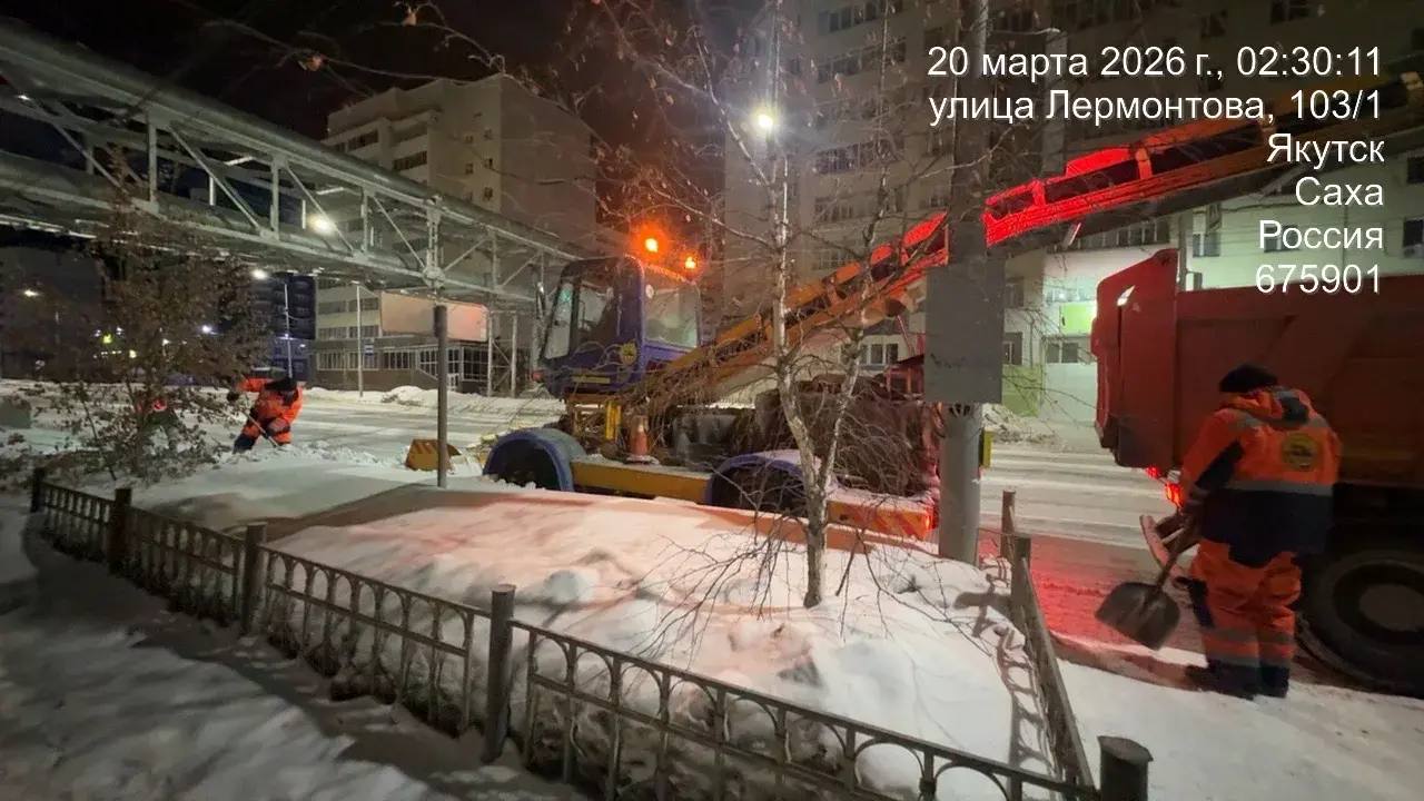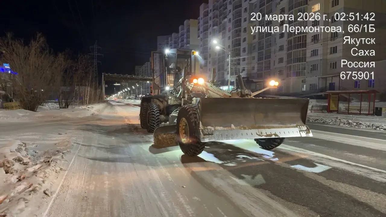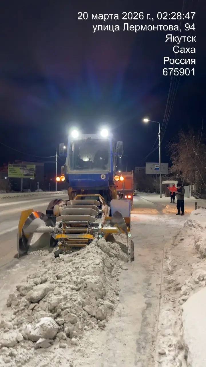 Кадры работ ночной смены АО Якутдорстрой по уборке снега