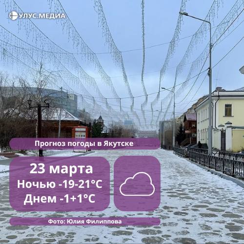 В Якутске преимущественно без осадков, ветер юго-восточный 3-8 м/с, днем порывы 8-13 м/с. Ночью термометры покажут -19-21°, днем -1+1°.
