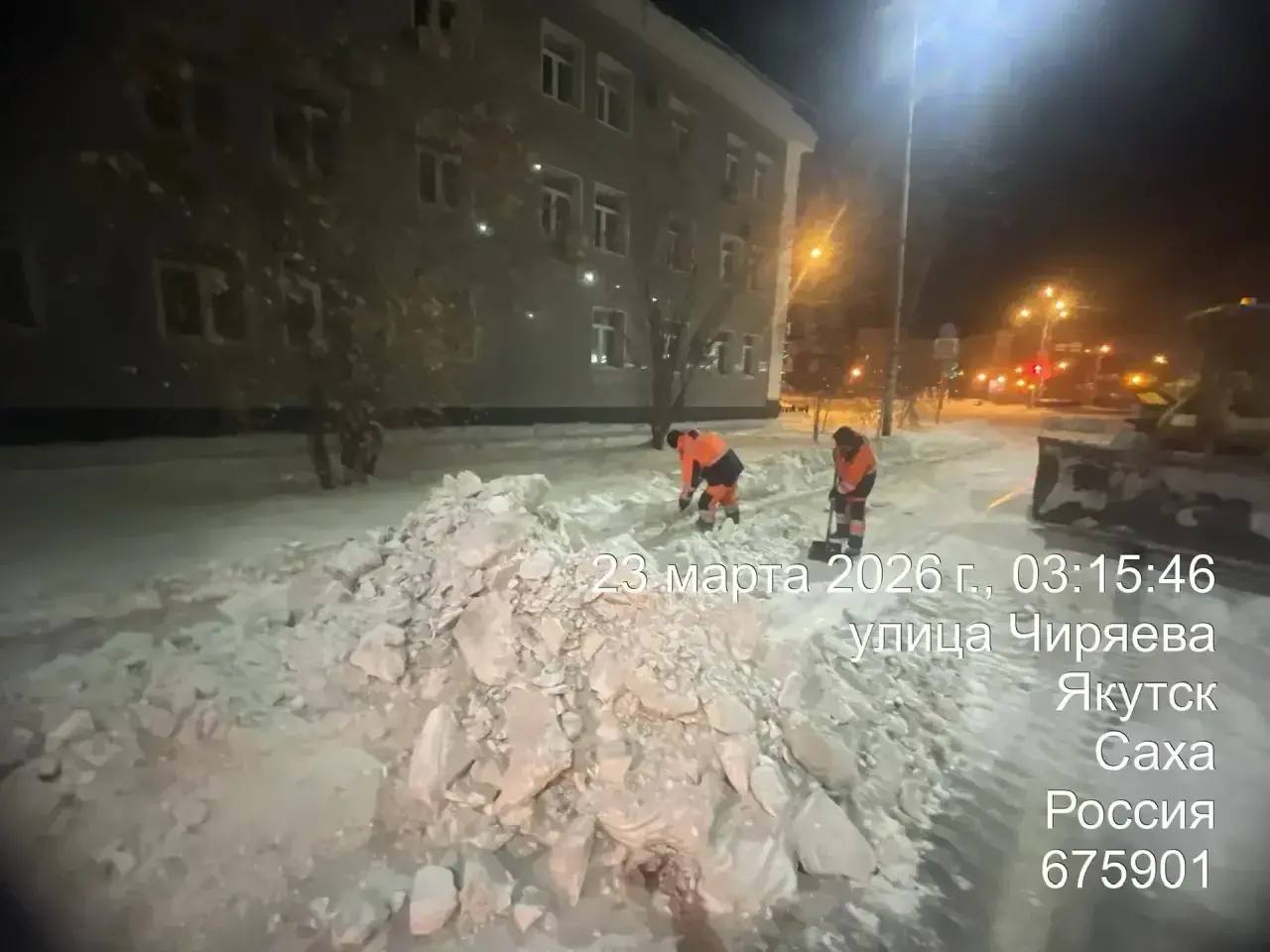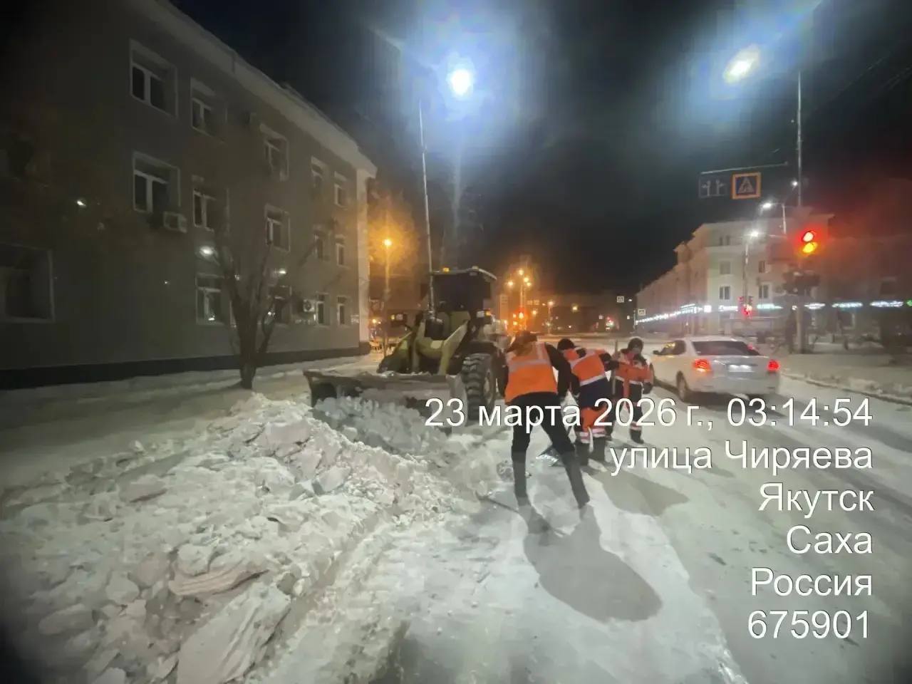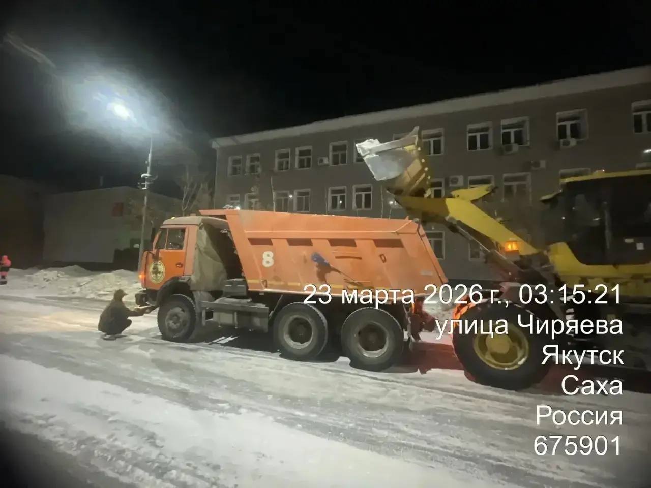Кадры ночных работ по уборке снега по ул. Чиряева.