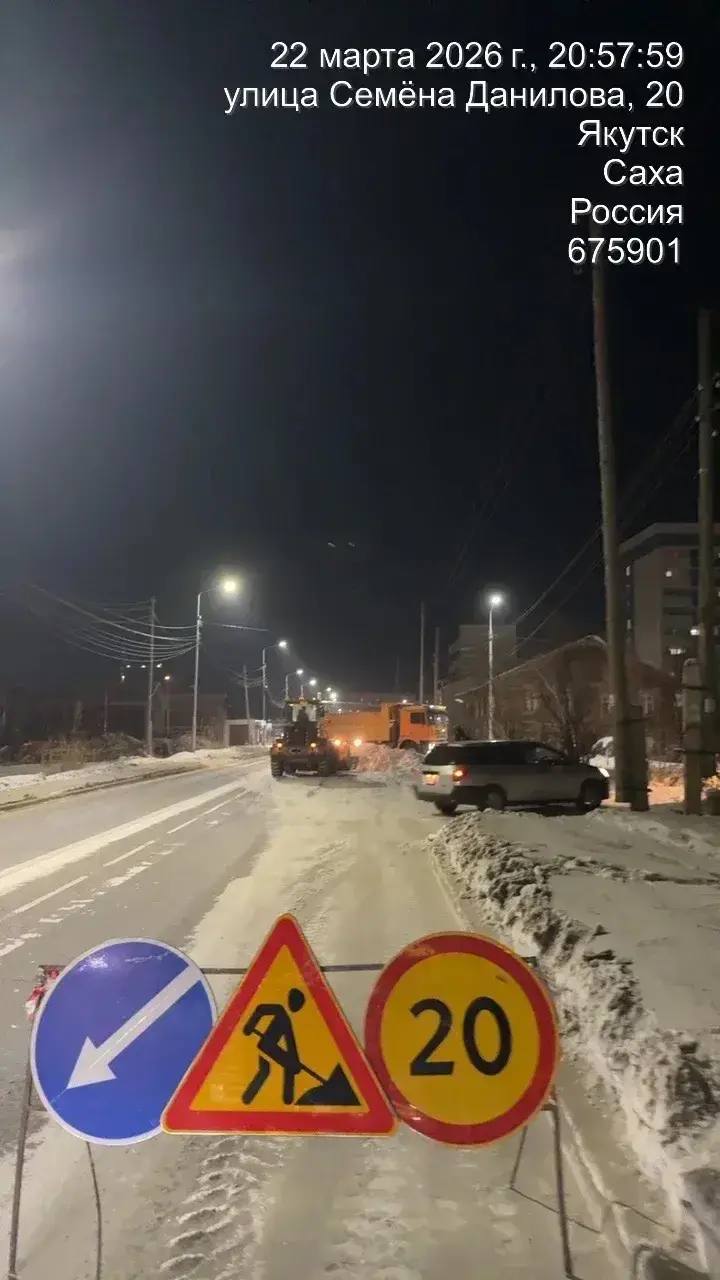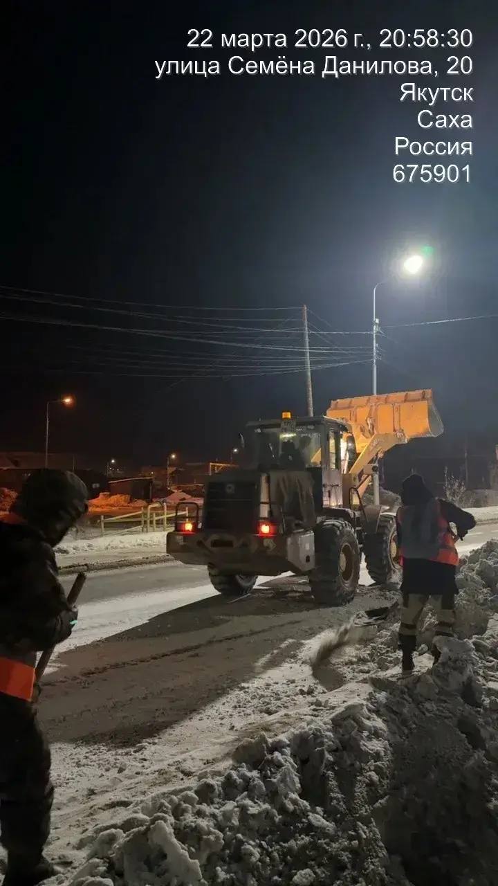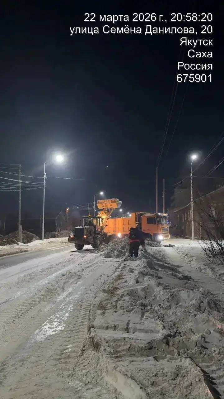 Кадры ночных работ по уборке снега по ул. Семена Данилова.