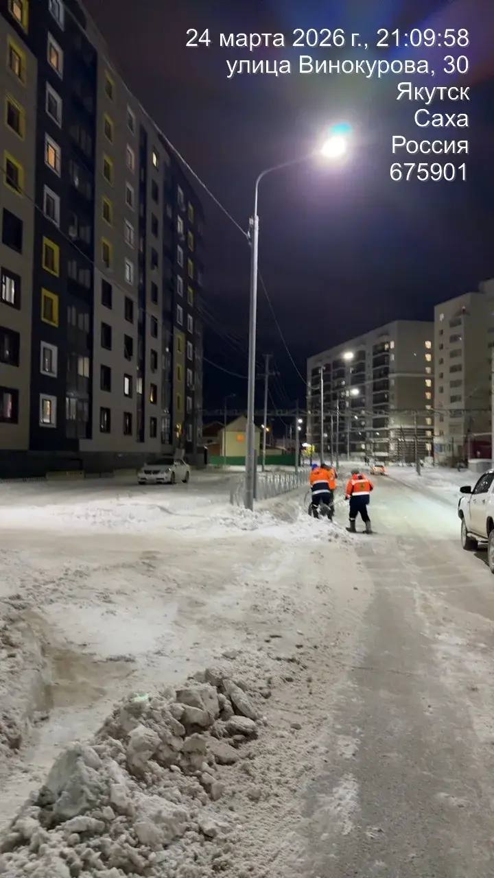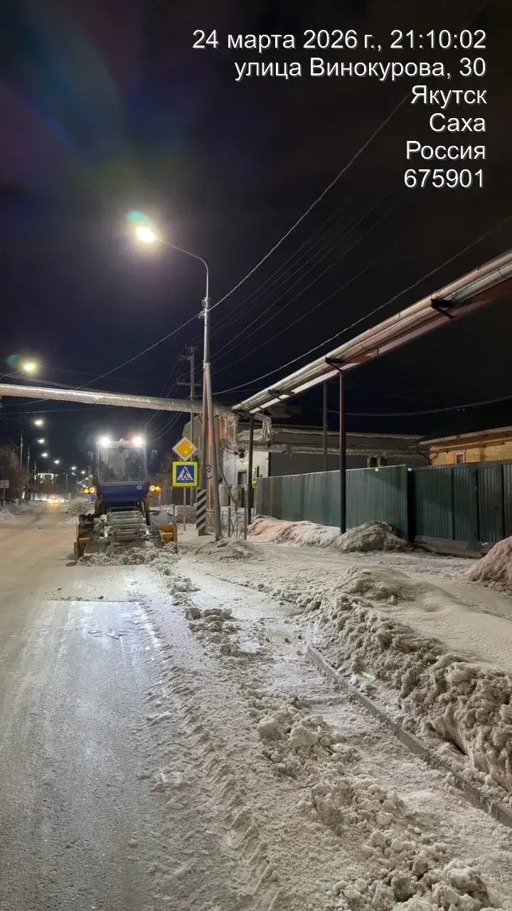 Кадры ночных работ по погрузке снега по ул. Винокурова.