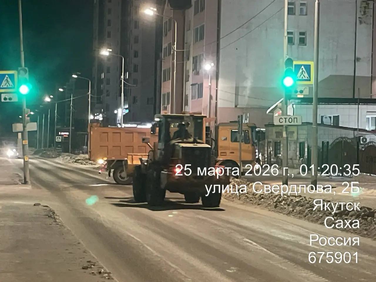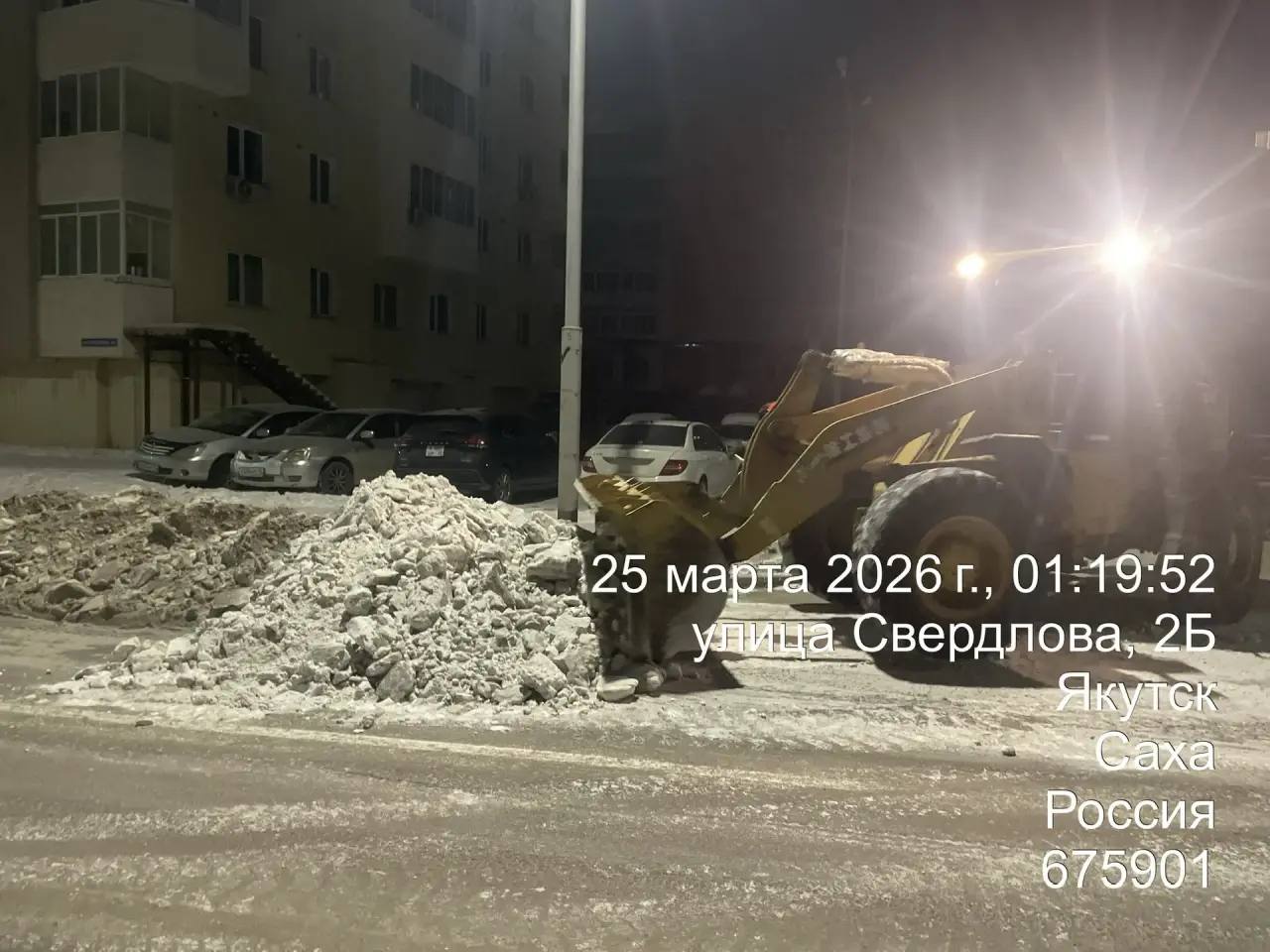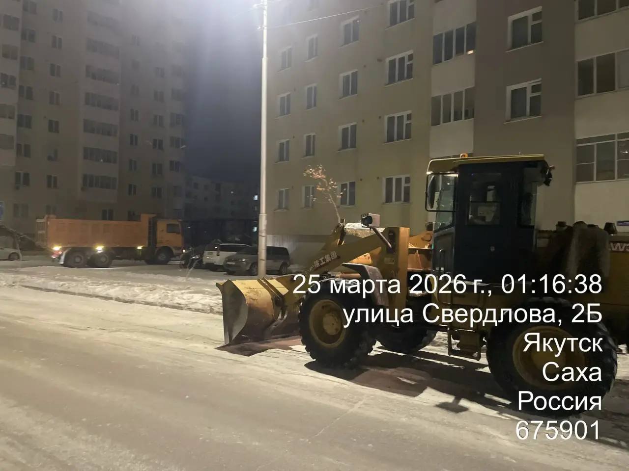 Кадры ночных работ по вывозу снега по ул. Свердлова.