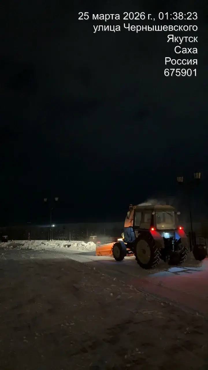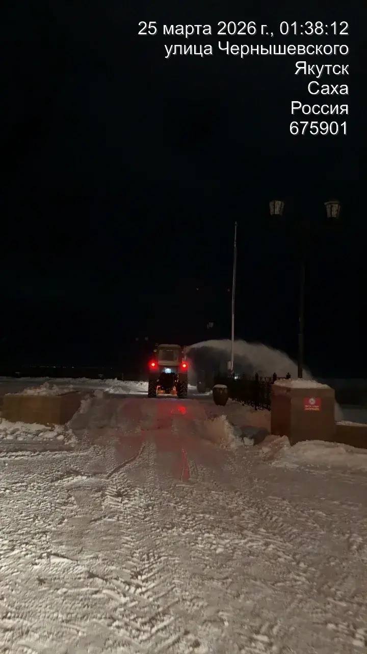 Кадры ночных работ шнекороторной техники по ул. Федора Попова.