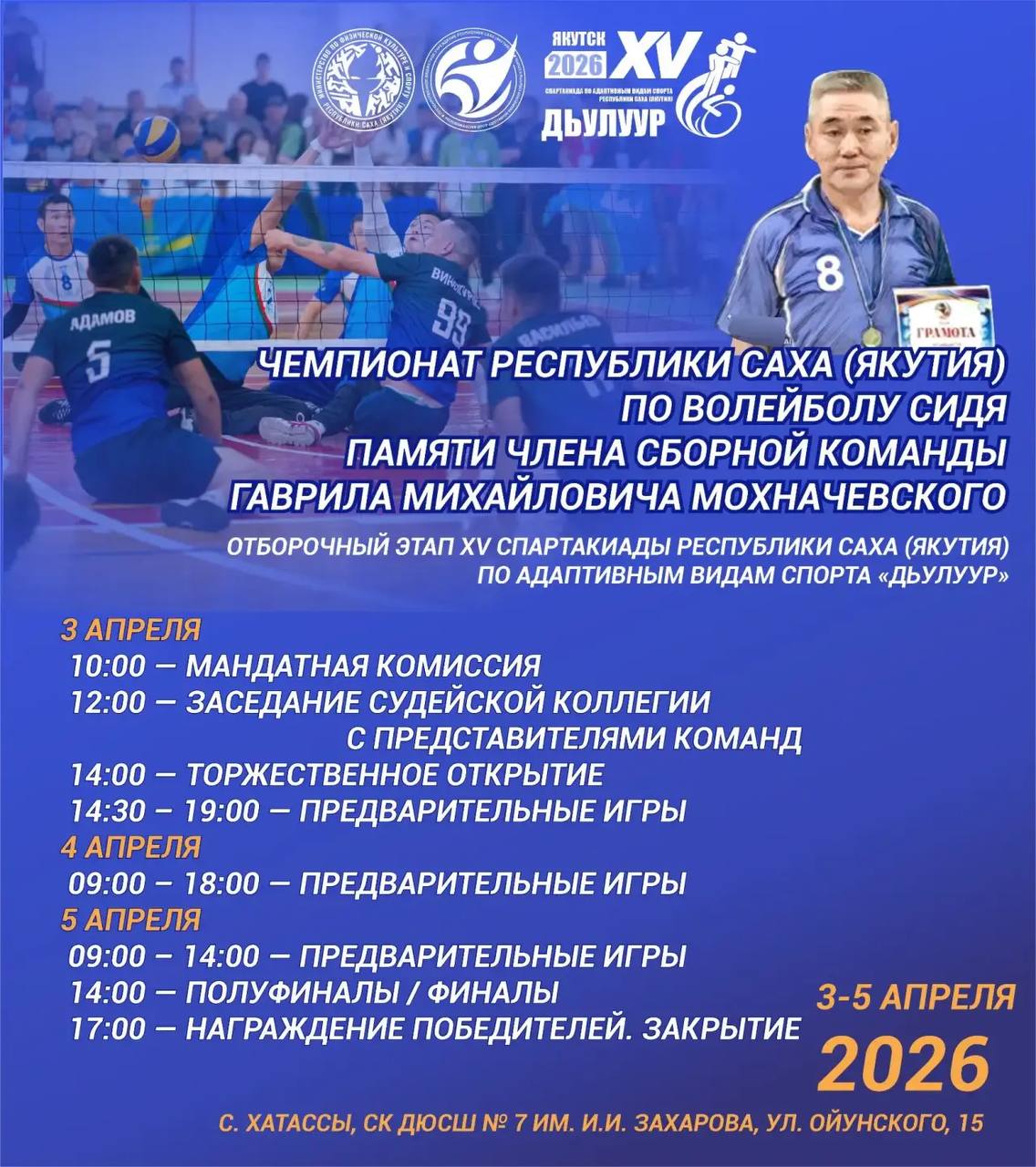 Со 3 по 5 апреля 2026 года в селе Хатассы пройдут одни из самых зрелищных и волевых соревнований — Чемпионат Республики Саха (Якутия) по волейболу сидя памяти члена сборной команды Гаврила Михайловича Мохначевского.