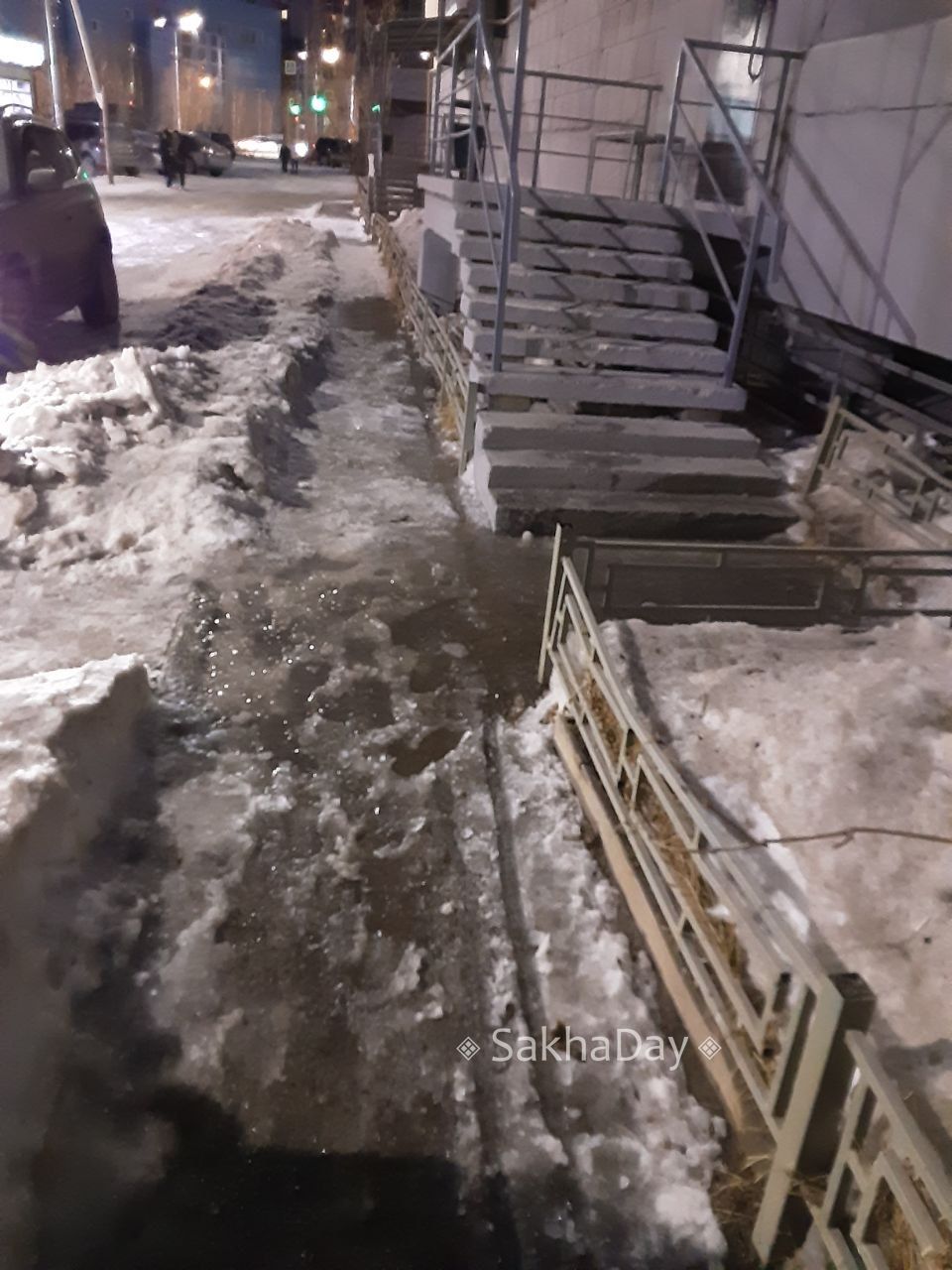 #пишут Это двор по адресу Ойунского 20/1. Наша ук Квартал 36. Неоднократно делали заявки чтобы убрали кучи снега. Они это не сделали. И вот на днях случился несчастный случай. Девушка шла домой и прямо взле ступеней, там где замерзла натаявшая от снега вода, подскользнулась и ударилась лицом о бетонные ступени. Она держалась за лицо сидя в луже. Хорошо рядом была ее мама, она смогла ее поднять. Мы снова позвонили в ук скзали что произошло, попросили снова убрать снег. В ответ полный игнор. Я не знаю чего они еще ждут. Может смерти чьей нибудь?! У меня у самой бабушка, ходит с палочкой!