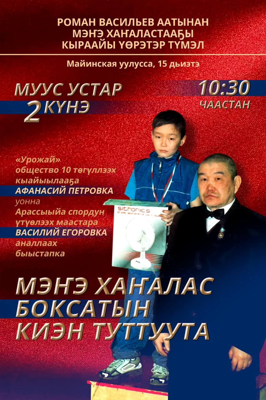 Киэн туттар биир дойдулаахтарбыт – ССРС спордун маастарыгар кандидат, боксаа «Урожай» общество 10 тгллээх кыайыылааа, уос номоо буолбут боксер Афанасий Петров уонна Арассыыйа спордун тлээх маастара, аан дойду чмпйнэтин иккис миэстэлэээ, Европа икки тгллээх чмпйнэ, Арассыыйа биэс тгллээх чмпйнэ Василий Егоров ситииилэрин кэрэилиир «Мээ Хаалас боксатын киэн туттуута»быыстапка рлээх арыллыытыгар кыттыыны ыларгытыгар ыырабыт.