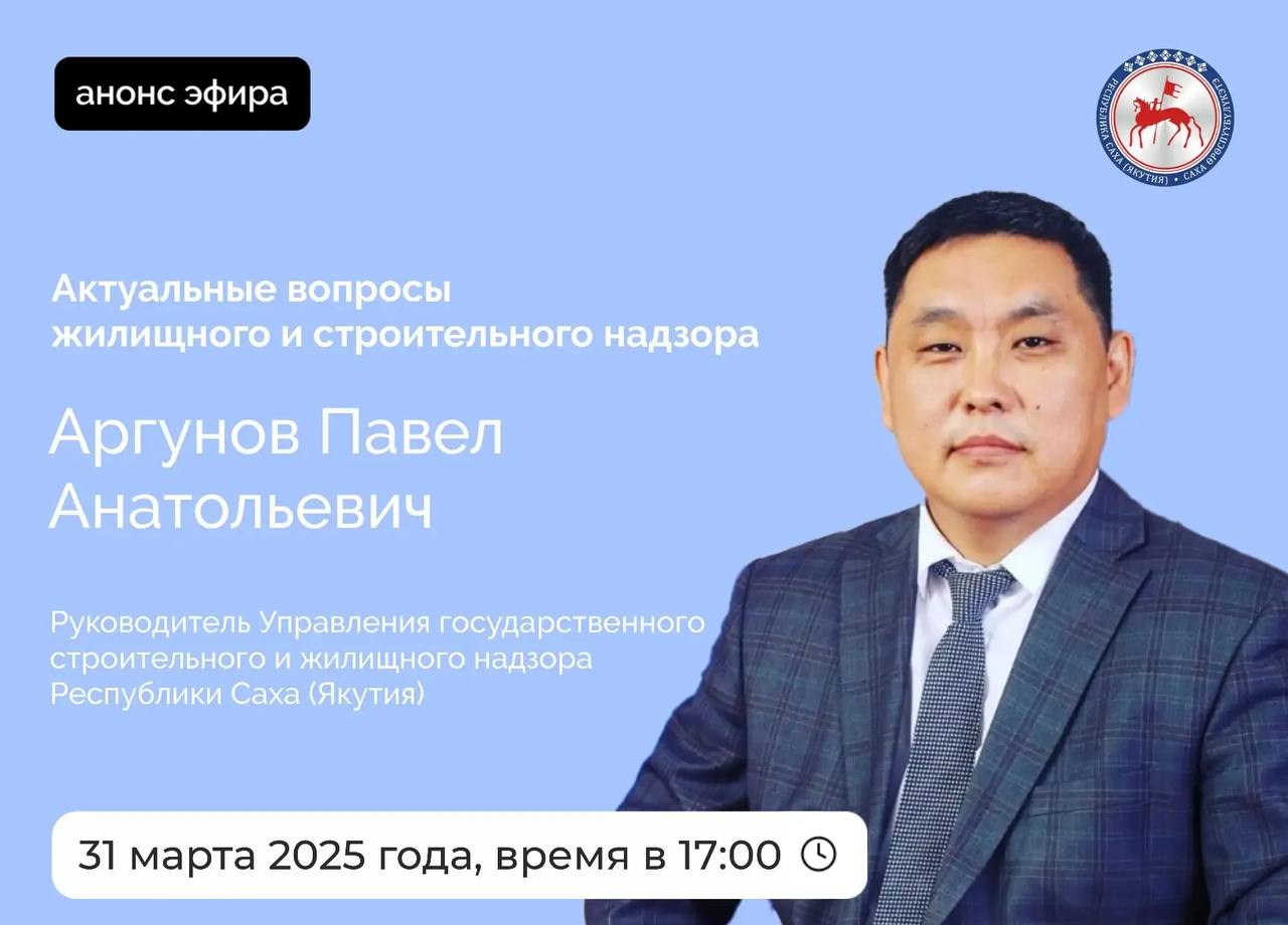 Руководитель Управления государственного строительного и жилищного надзора Республики Саха (Якутия) Аргунов Павел Анатольевич во вторник, 31 марта 2026 года, проведет прямой эфир на официальных страницах Администрации Главы и Правительства республики в социальных сетях «ВКонтакте» и «Одноклассники».
