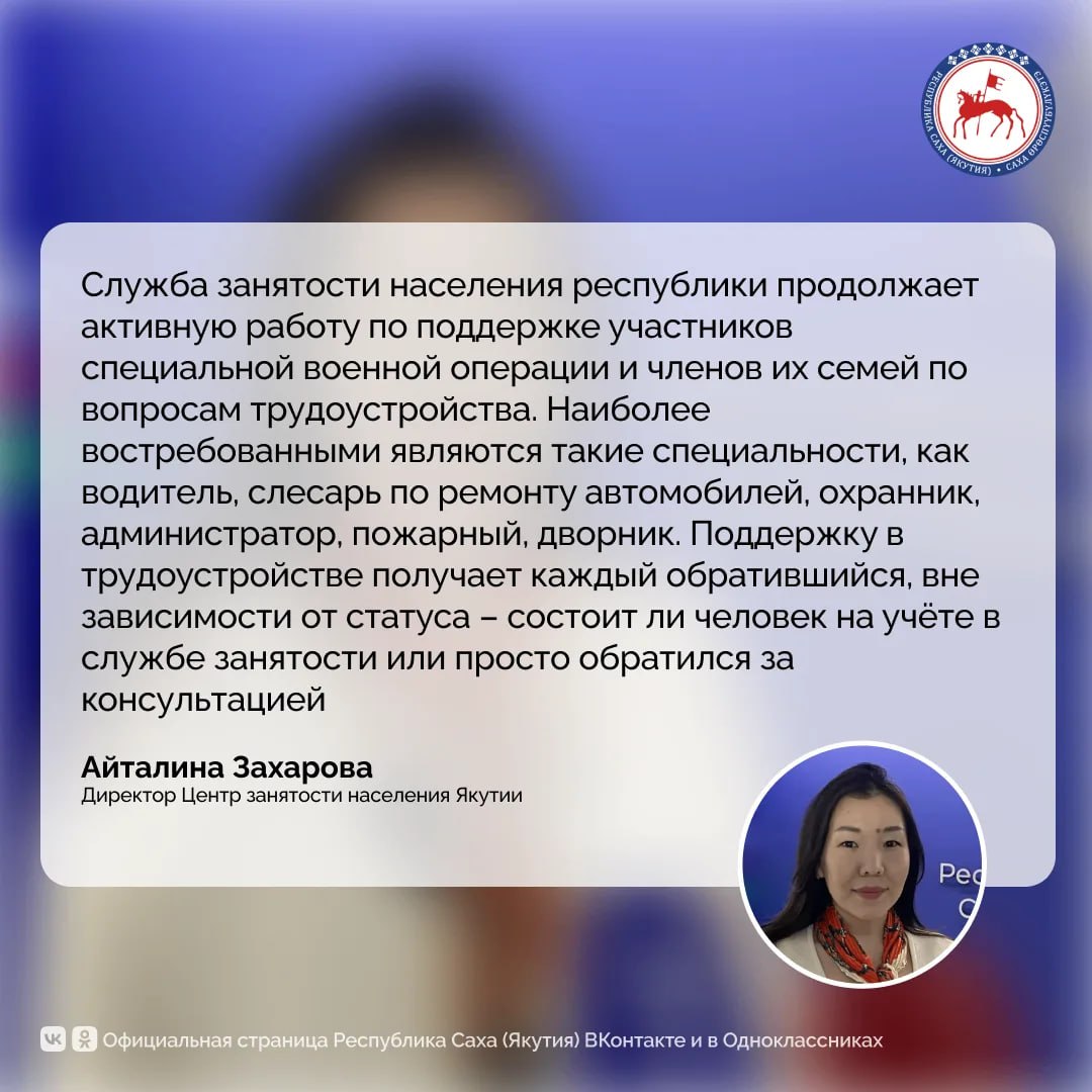 По линии Служб занятости с начала года трудоустроены 52 участника специальной военной операции и 21 член семей военнослужащих. Об этом сообщила директор Центр занятости населения Якутии Айталина Захарова.