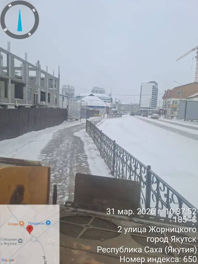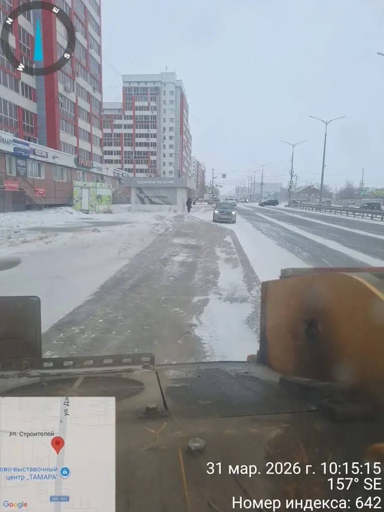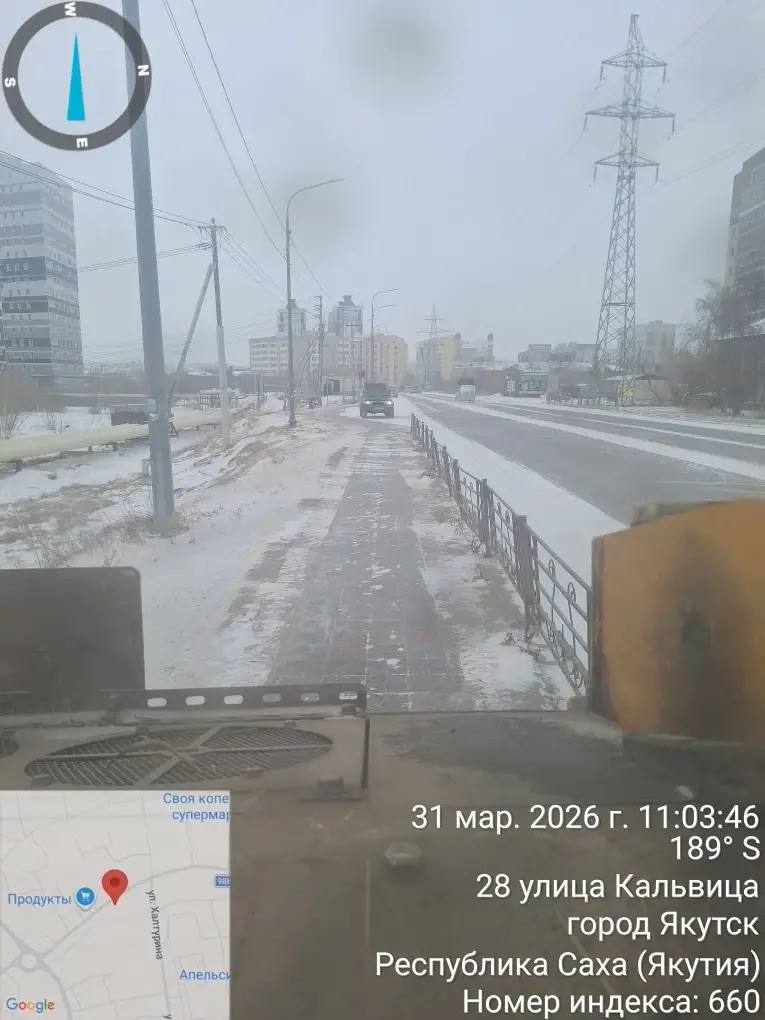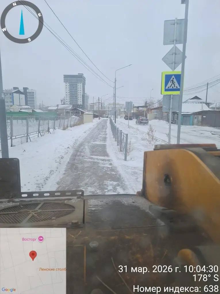 Уборка тротуаров от снега подрядной организацией на территории Строительного округа.