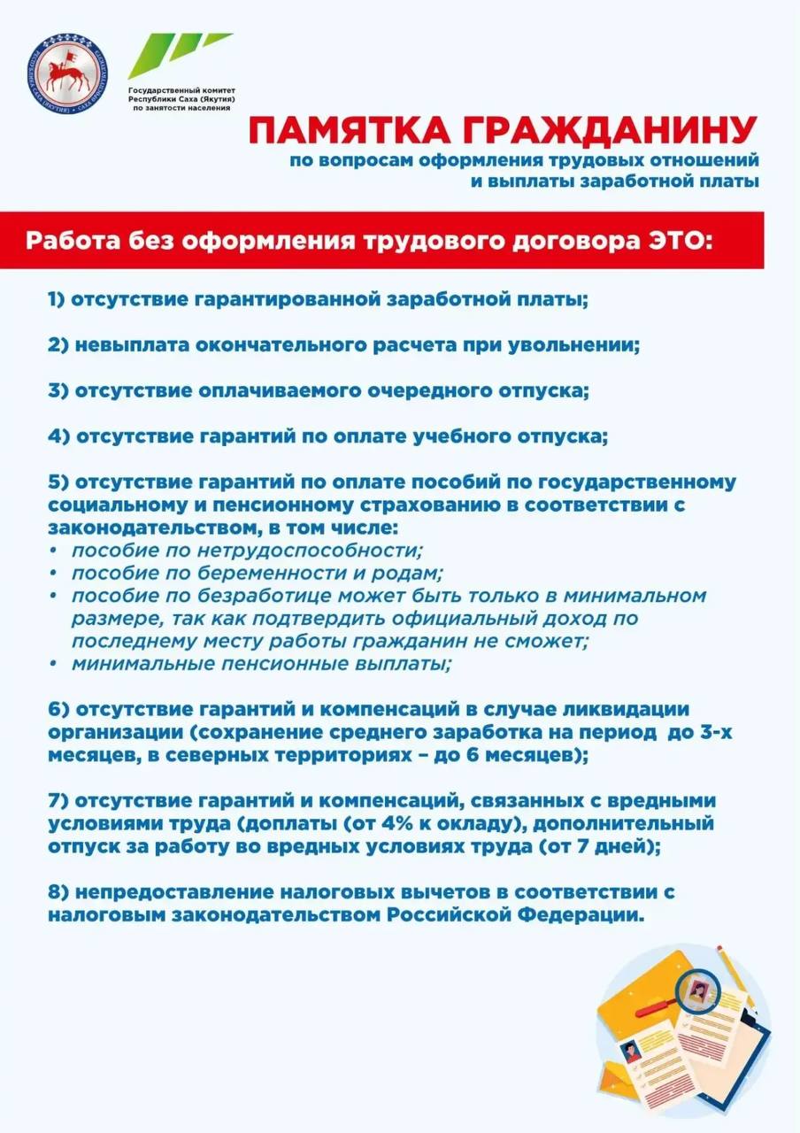 Памятка Государственного комитета Республики Саха (Якутия) по занятости населения для граждан по вопросам оформления трудовых отношений и выплат заработной платы