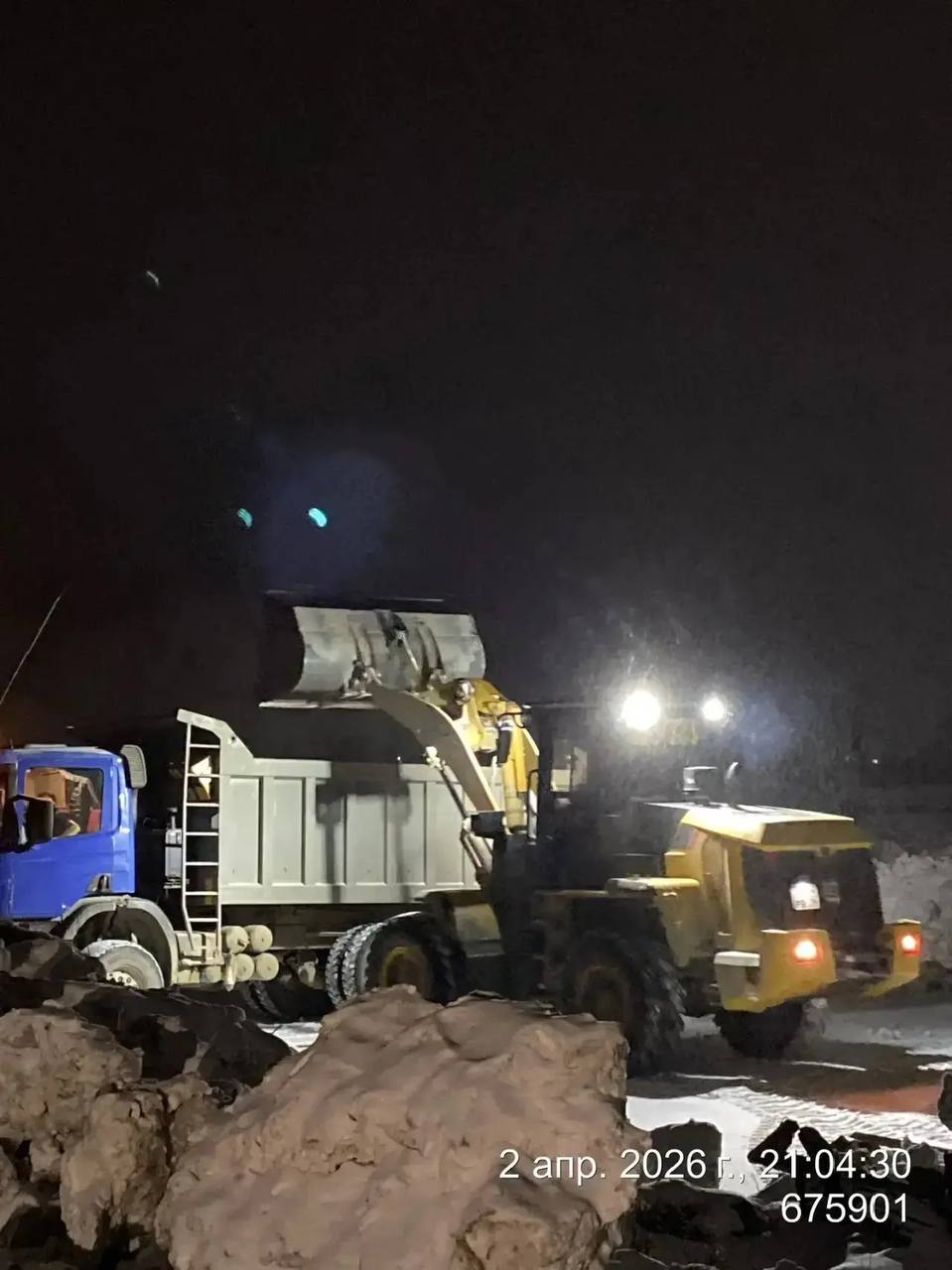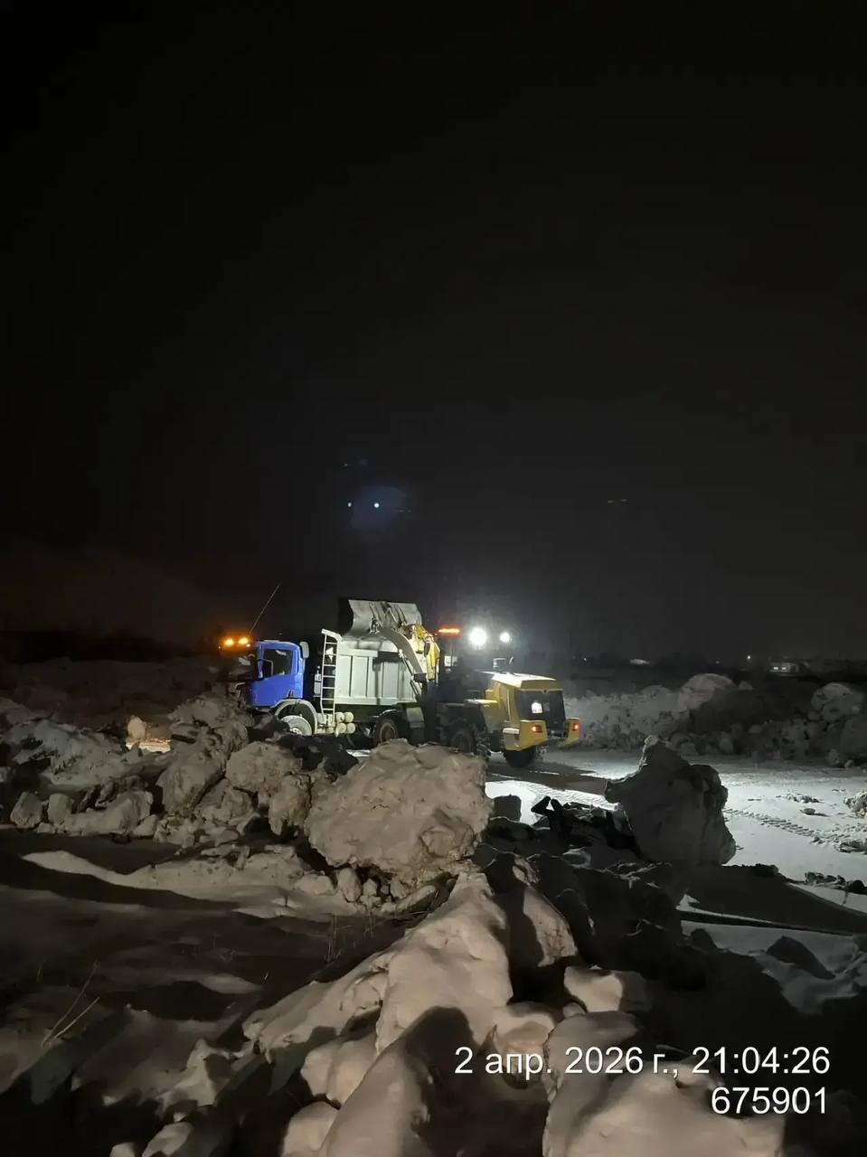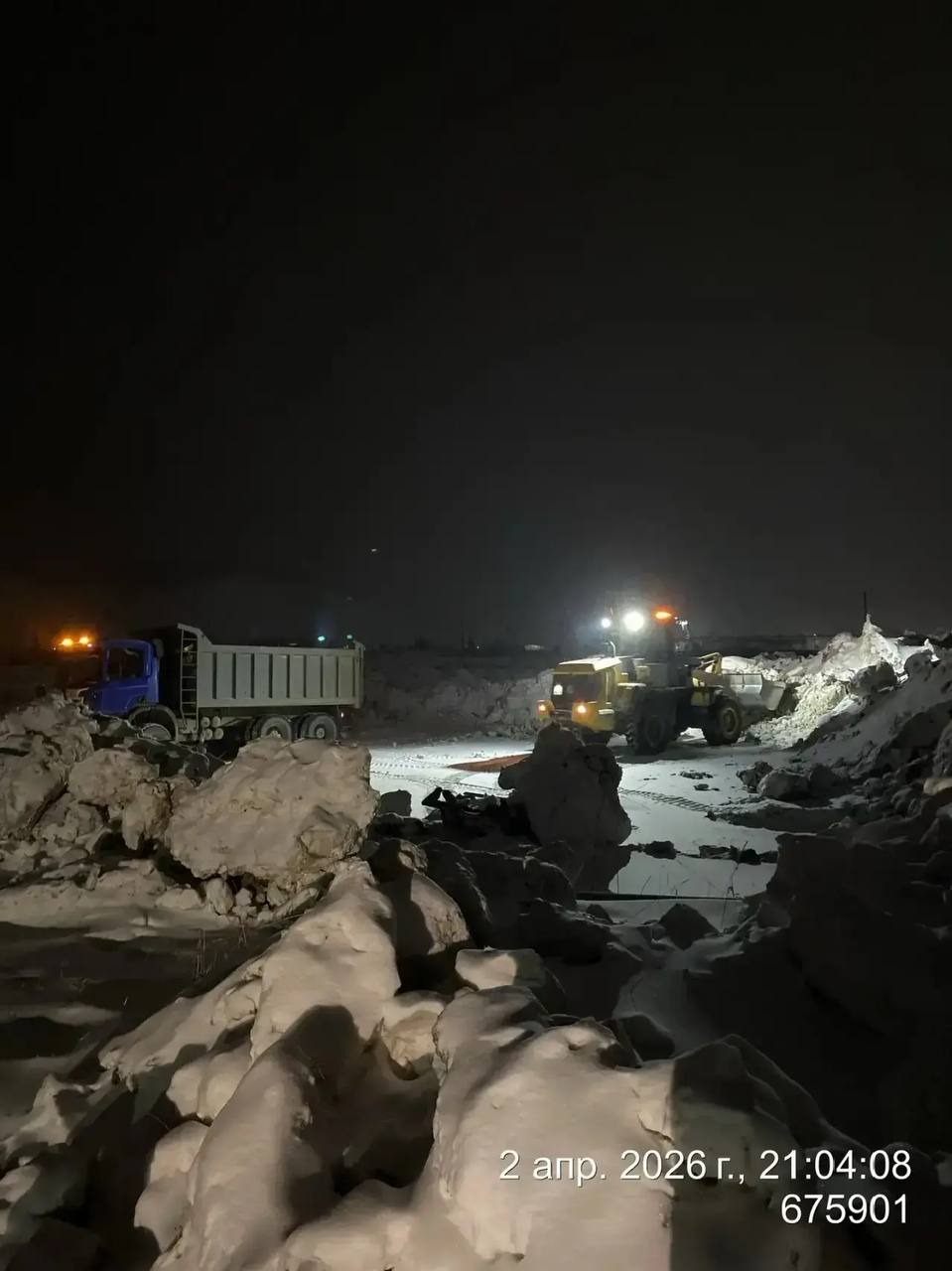 Ночные работы по вывозу снега с временного полигона, мкр. Птицефабрика.