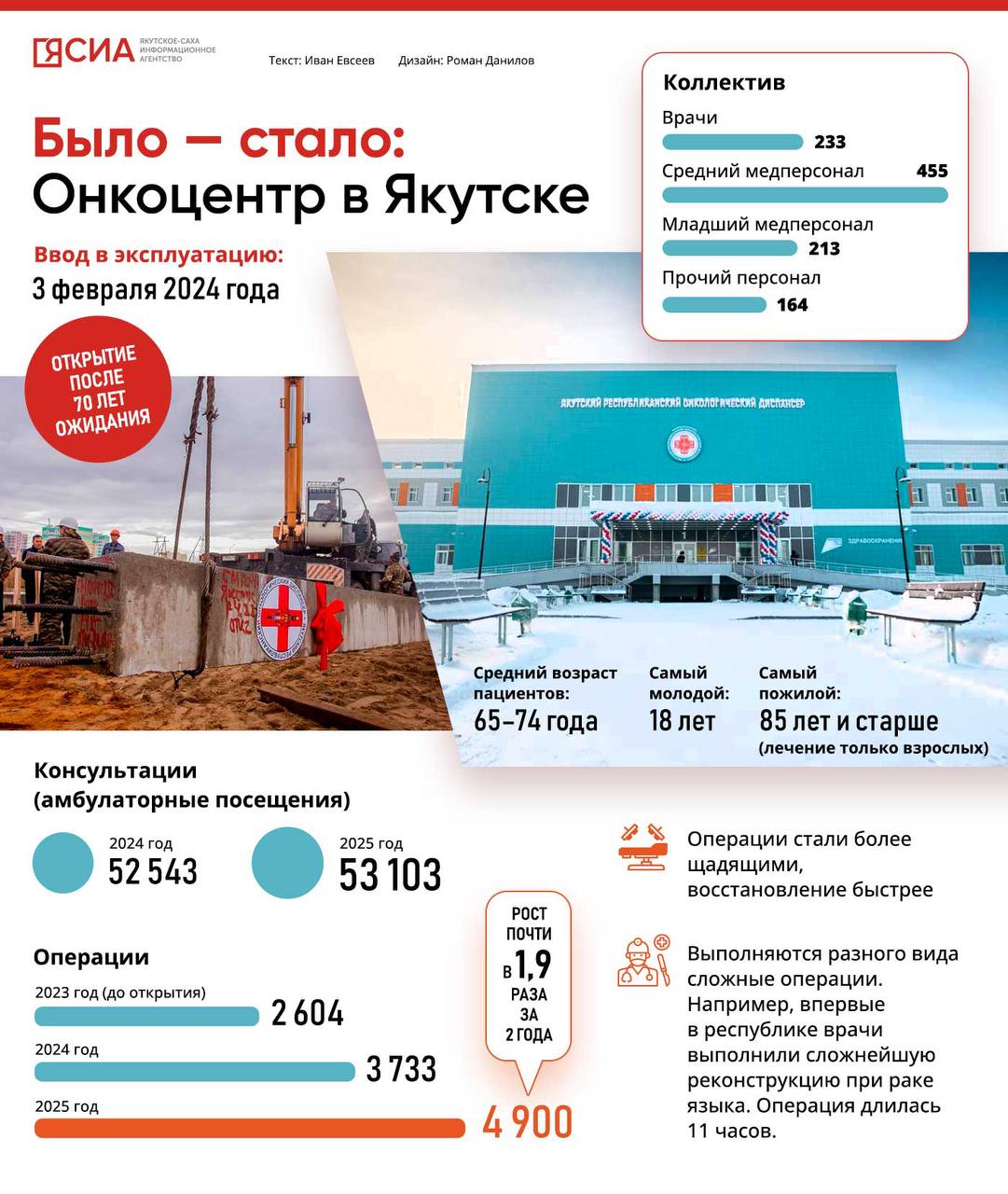 Этого события ждали более 70 лет. В открытии принял участие президент России Владимир Путин: в режиме видеосвязи он пообщался с главой республики АйсеномНиколаевым и главным врачом онкодиспансера Татьяной Николаевой. Уникальный медицинский объект общей площадью более 25 тысяч квадратных метров, состоящий из консультативно-диагностических и стационарных отделений с наилучшими условиями для пациентов и медицинского персонала, открыт в рамках проекта «Здравоохранение». Центр оснащен самым современным оборудованием, которое отвечает всем стандартам мировой и российской практики.
