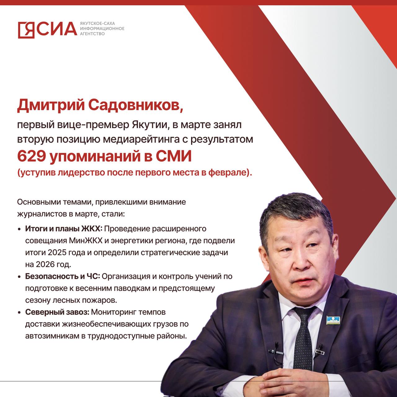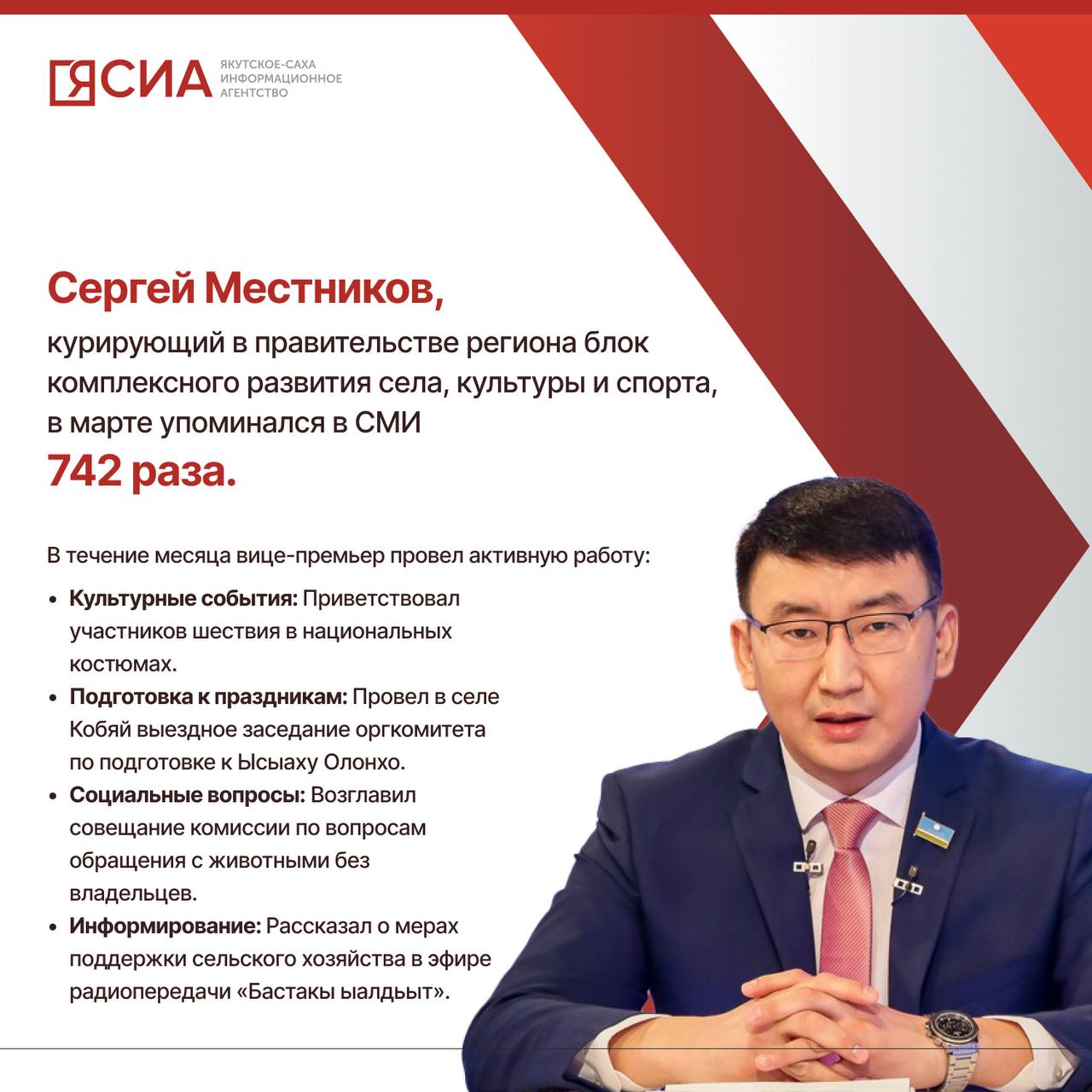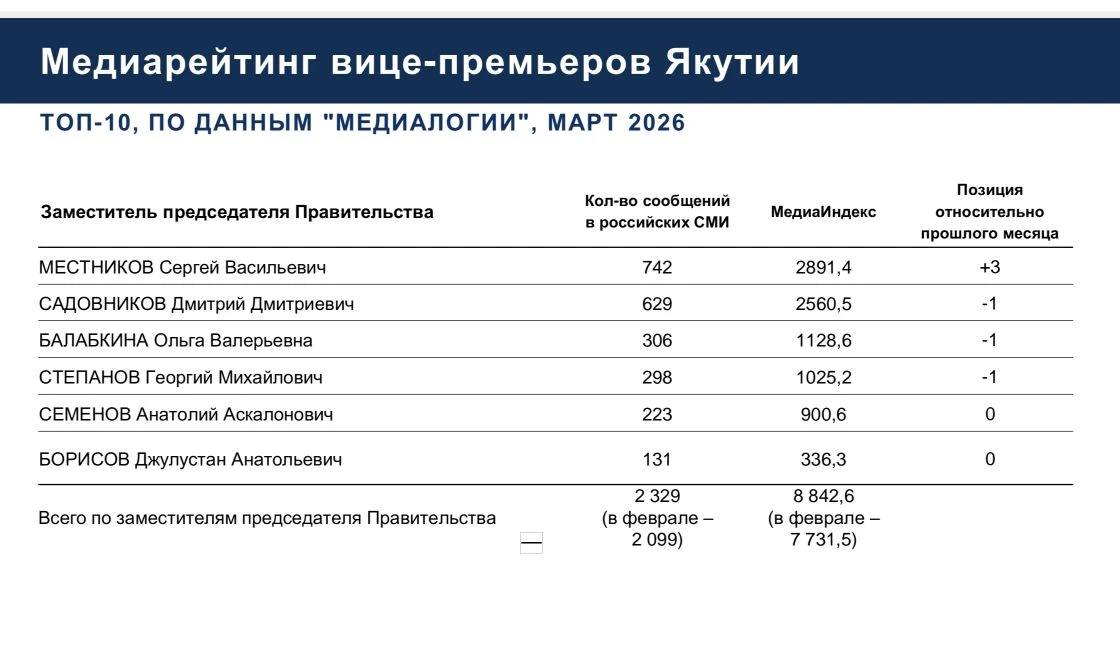 Медиалогия представила медиарейтинг вице-премьеров Якутии, где лидерство досталось Сергею Местникову.
