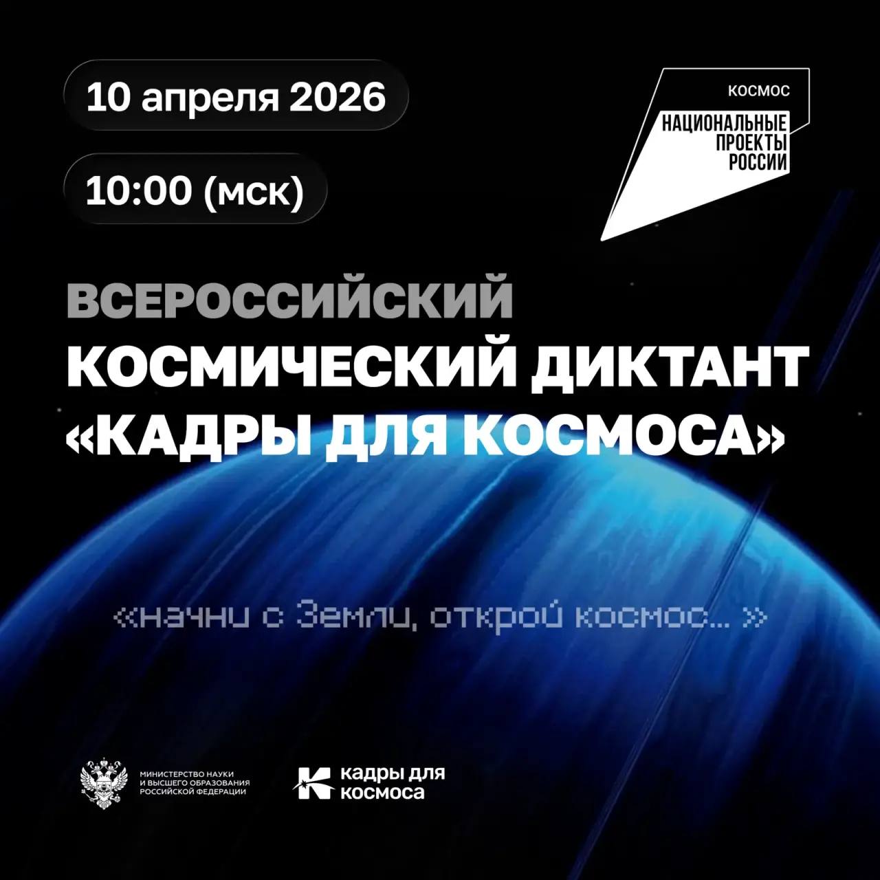10 апреля в 10:00 (мск), в преддверии Дня космонавтики 12 апреля, проектный офис федерального проекта «Кадры для космоса» Минобрнауки России вновь проведёт ежегодный Всероссийский космический диктант на сайте КадрыДляКосмоса.рф