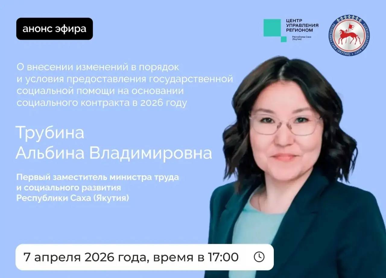 Первый заместитель министра труда и социального развития Республики Саха (Якутия) Трубина Альбина Владимировна во вторник, 7 апреля 2026 года, проведет прямой эфир на официальных страницах Администрации Главы и Правительства республики в социальных сетях «ВКонтакте» и «Одноклассники» совместно с ЦУР Якутии.