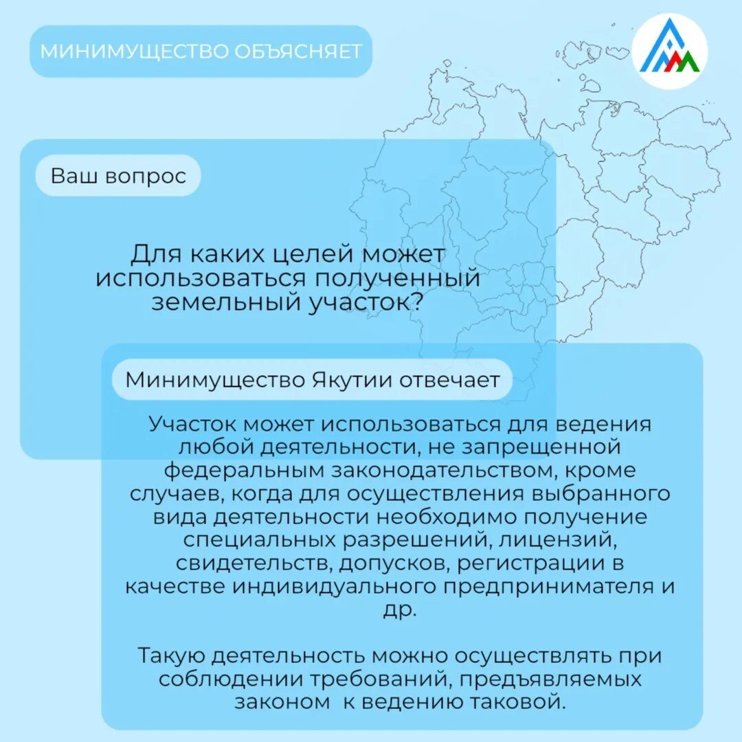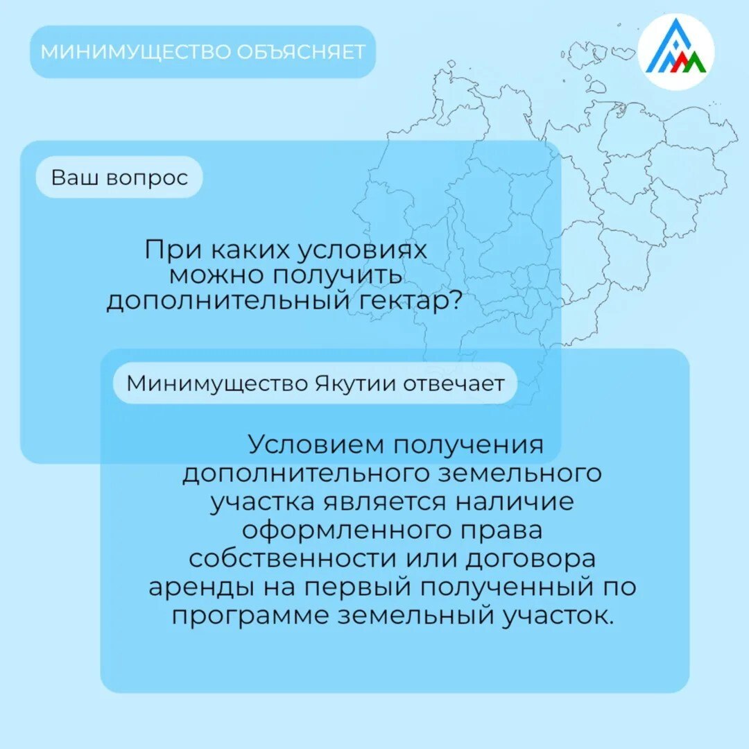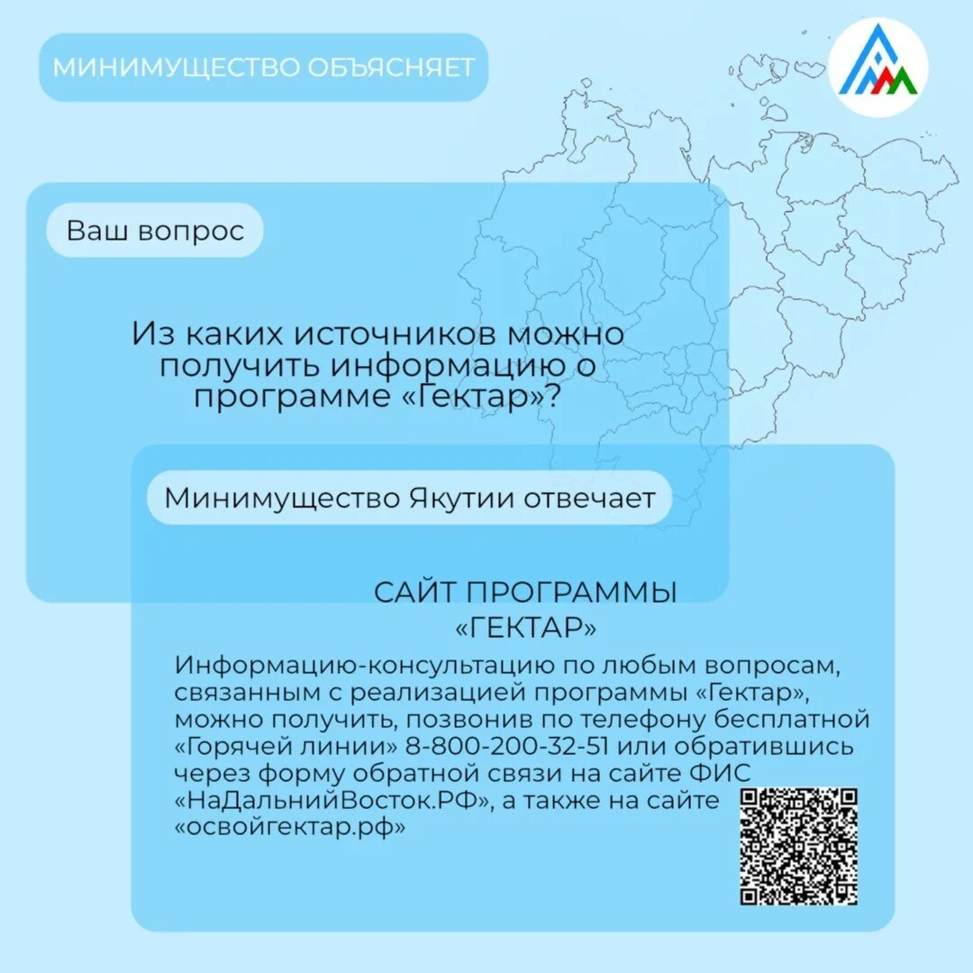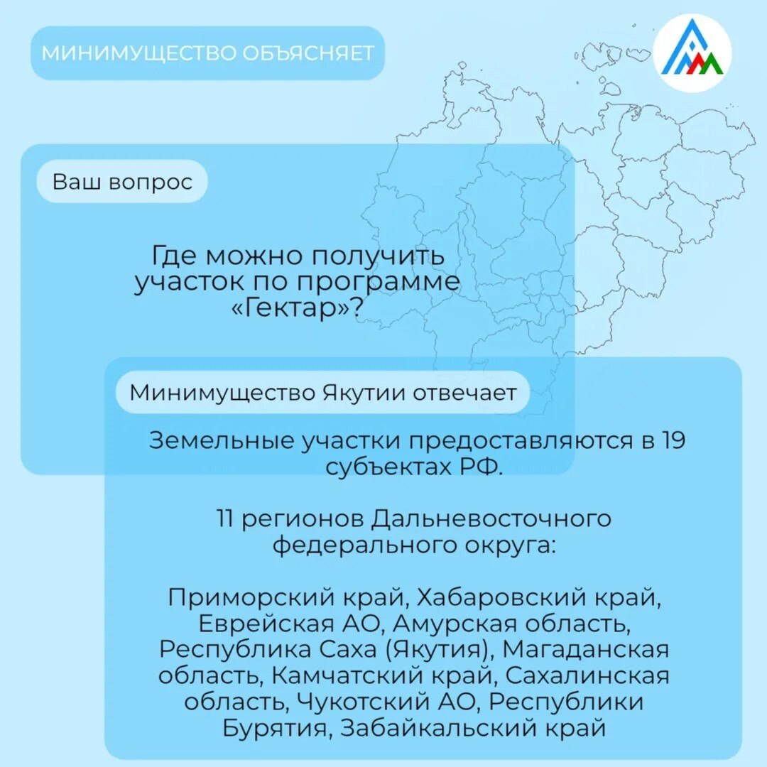Министерство имущественных и земельных отношений Якутии отвечает на вопросы граждан, поступающие через социальные сети. Среди наиболее часто задаваемых вопросов о предоставлении земельного участка в рамках программы «Дальневосточный гектар».