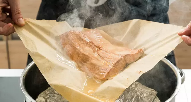 Тарелку с рыбой ставят на миску, проверяют устойчивость конструкции и плотно накрывают кастрюлю фольгой. Кастрюлю помещают на плиту и нагревают на среднем огне. Через 3 минуты можно ощутить запах дыма. Коптить рыбу лучше 15–20 минут, чтобы избежать горького привкуса. Оптимальный цвет готовой форели — золотисто-желтый с легким карамельным оттенком.