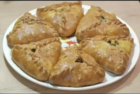 Следующий этап — формирование пирогов. Разделив тесто на шесть равных частей и скатав их в шарики, стоит дать им отдохнуть в течении 20 минут. Раскатав каждую часть, кладут начинку, собирают тесто с трех сторон и формируют треугольник, оставляя небольшое «окошко» сверху для бульона.