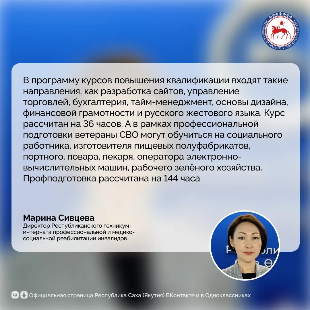 В Республиканском техникуме-интернате профессиональной и медико-социальной реабилитации инвалидов идёт набор участников специальной военной операции, ставших инвалидами в ходе боевых действий, на обучение на курсы повышения квалификации и профессиональной подготовки. Об этом на брифинге 9 апреля сообщила директор учреждения Марина Сивцева.