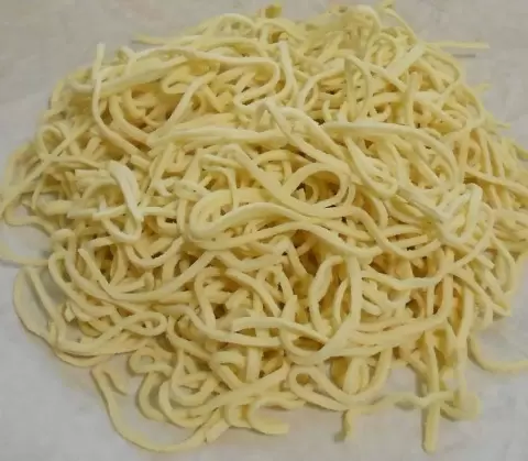 Получившийся тонкий пласт следует свернуть в трубочку и аккуратно нарезать, используя острый нож. Чтобы лапша не становилась слишком длинной, важно поворачивать её в процессе нарезки. Готовые кусочки немного присыпать мукой и оставить высыхать на столе, положив их на пергамент или газету.