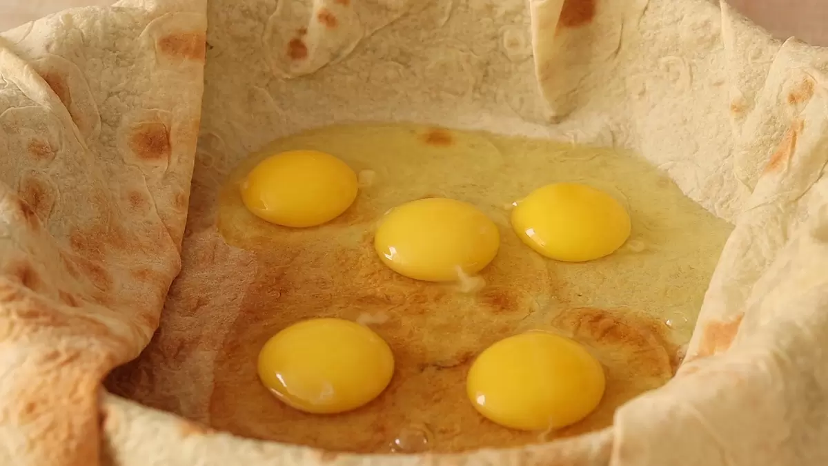 - Подготовьте лаваш, выложив его на сковороду, чтобы легко разместить начинку. Вбейте 5 яиц, добавьте соль и перец, хорошо перемешайте.