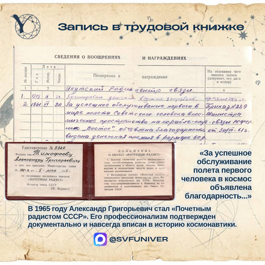 В его трудовой книжке до сих пор можно прочесть уникальную запись:«За успешное обслуживание полета первого человека в космос объявлена благодарность и выдана денежная премия». (12 апреля 1961 г.)