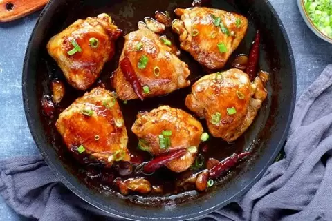 Тушение: Соедините устричный соус, рисовое вино, светлый и тёмный соевые соусы, сахар и черный перец с горячей водой. Влейте получившуюся смесь в сковороду, добавьте сушеный чили, если хотите остроты. Накройте крышкой и тушите на среднем огне 15 минут. Затем переверните курицу и готовьте ещё 10 минут для равномерного прогрева.