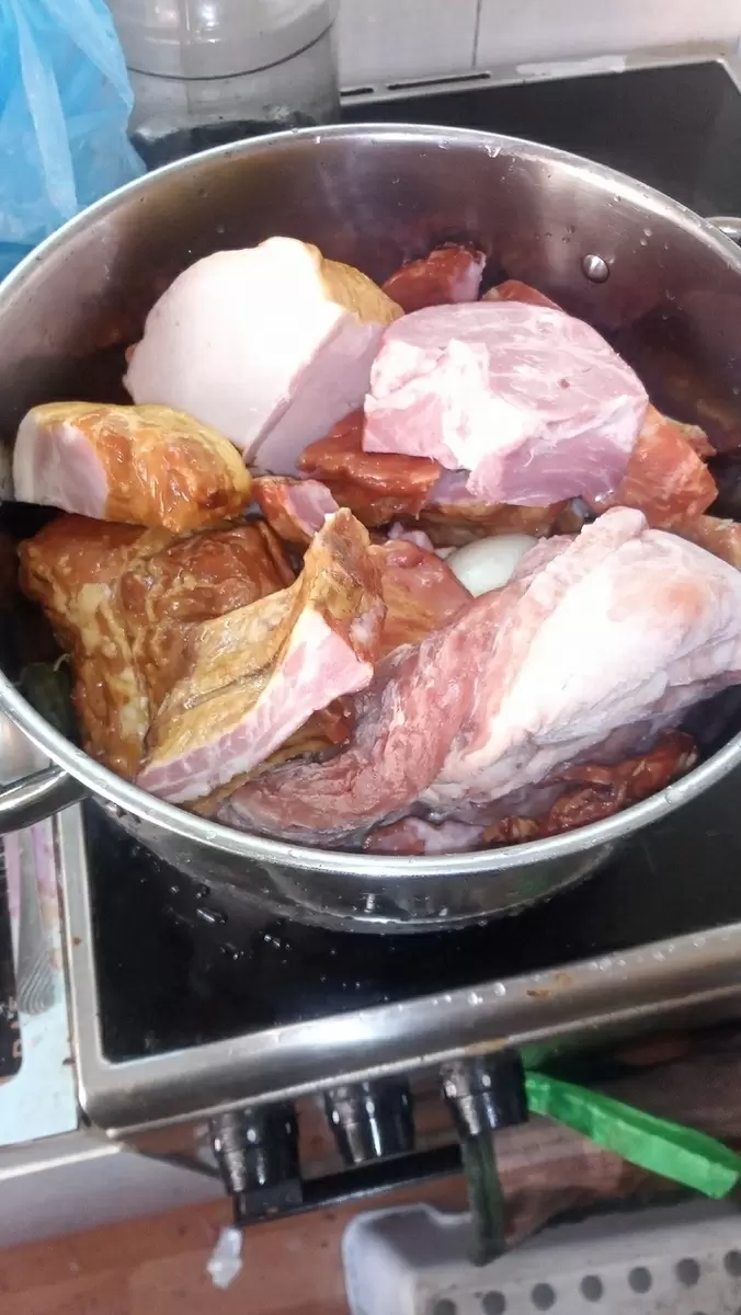 Для начала, в большую кастрюлю помещают все мясные составляющие (кроме колбас и ребрышек), добавляя одну луковицу. Заливают холодной водой и устанавливают на средний огонь. Доведя до кипения, уменьшают огонь и варят около двух часов, периодически снимая пену. После этого луковицу удаляют.