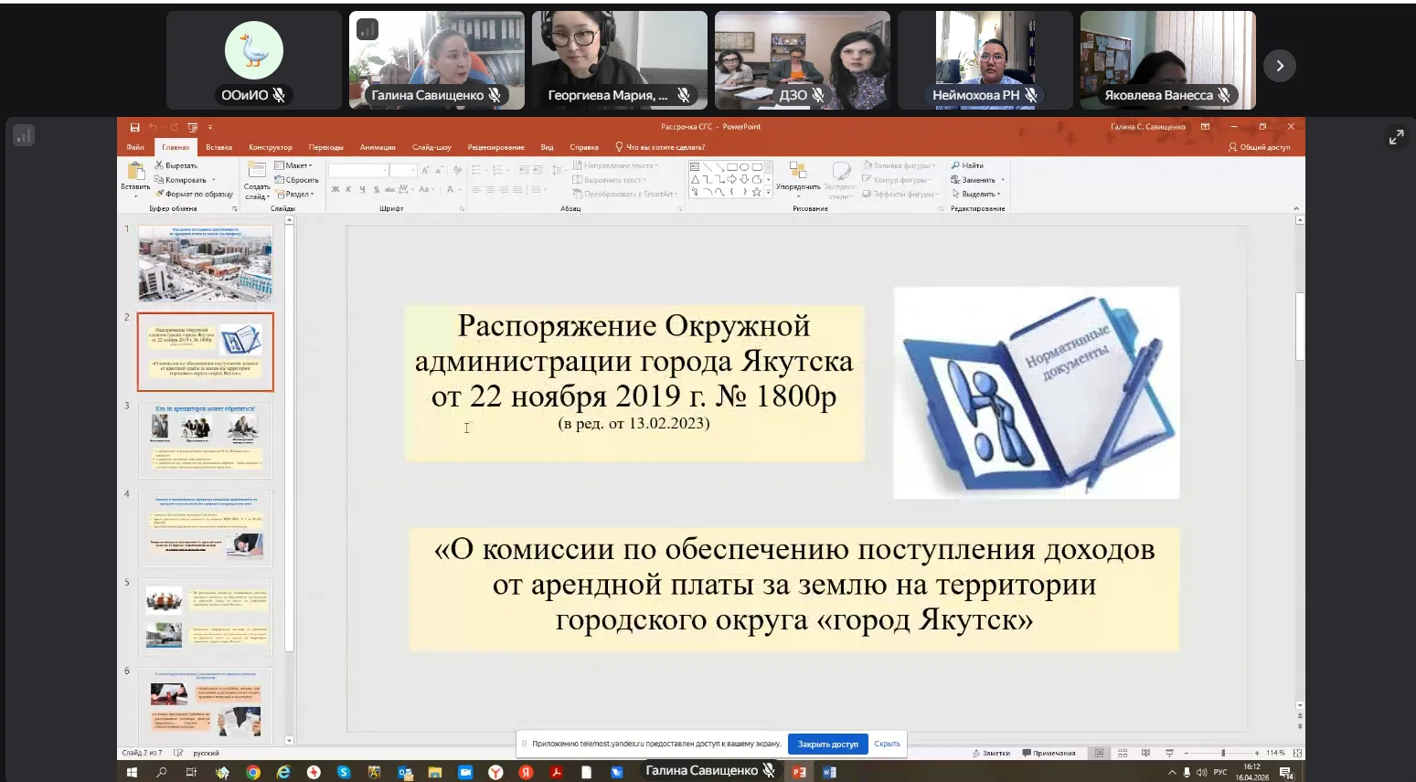 16 апреля была проведена рабочая встреча по обмену опытом в сфере земельных отношений в режиме видеоконференцсвязи с коллегами из Департамента земельных отношений городского округа Донецк во исполнение плана совместных мероприятий между Якутском и Донецком на 2026 год.