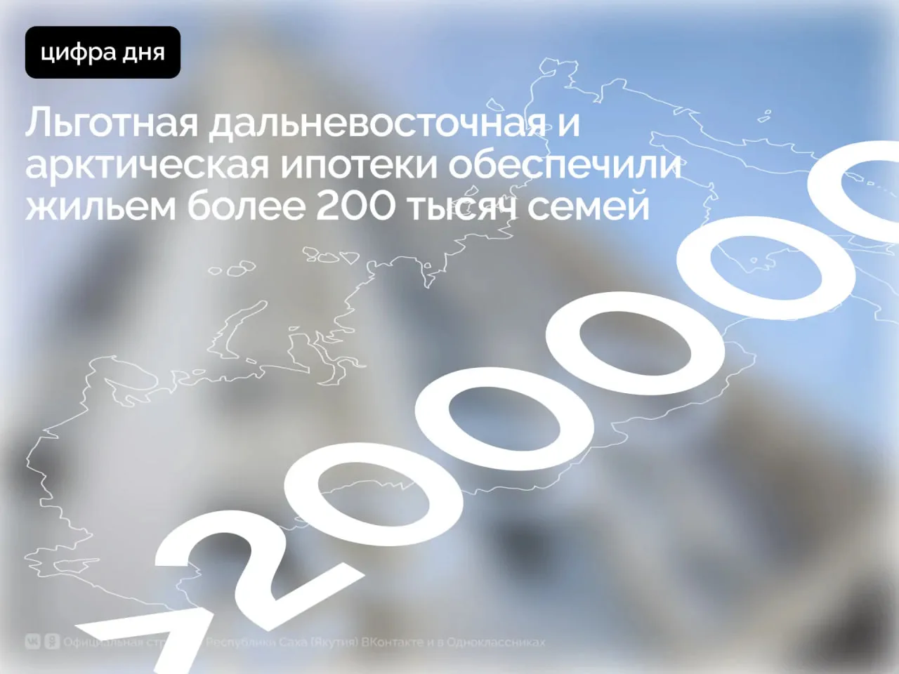 Объем льготных кредитов, выданных по программе «Дальневосточная и арктическая ипотека» под 2% годовых, превысил 1 трлн рублей. Благодаря президентской программе более 200 тыс. семей купили или построили жилье на Дальнем Востоке и в Арктике.