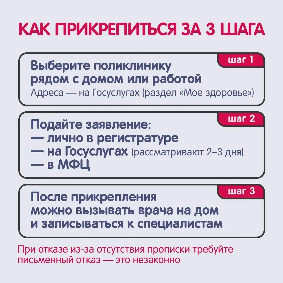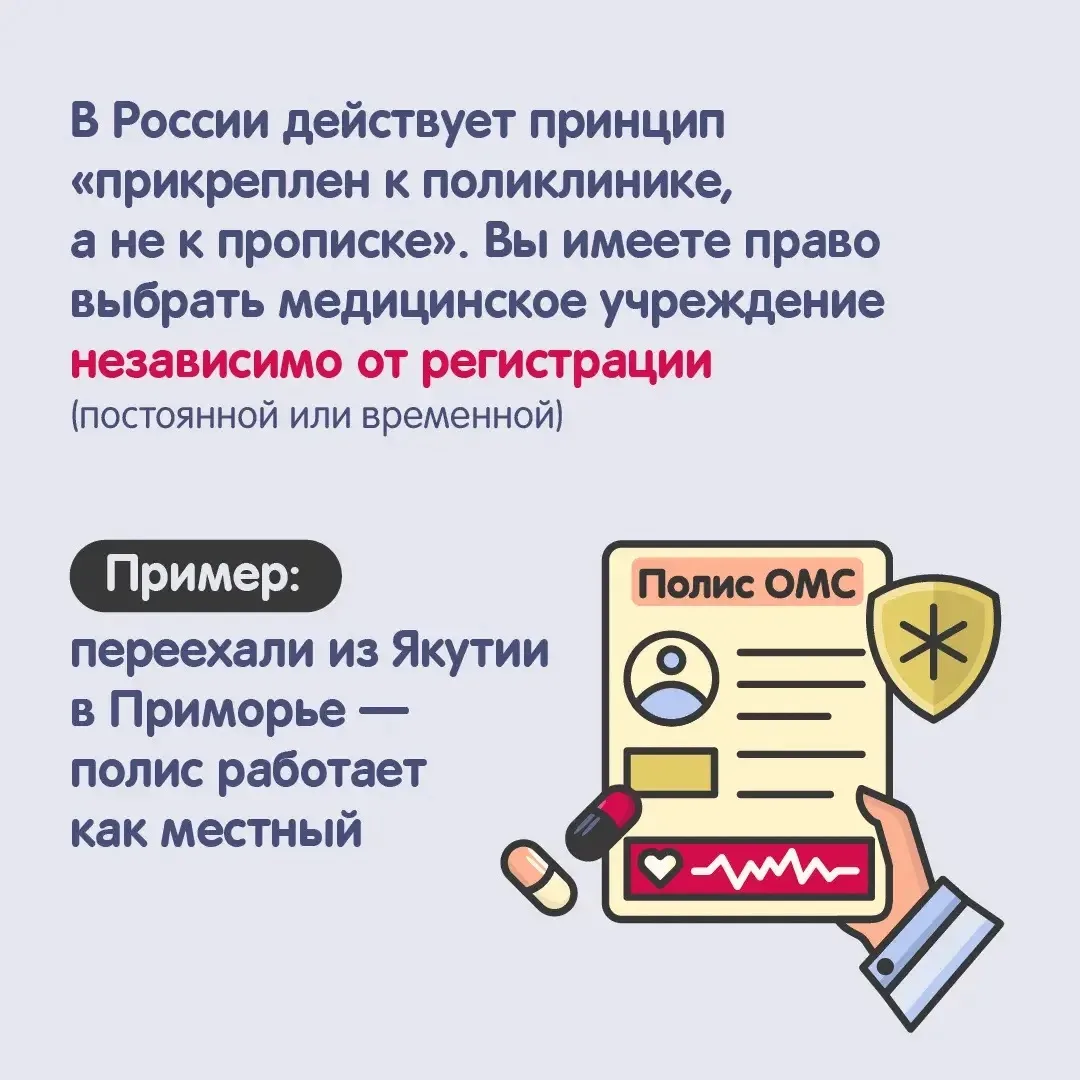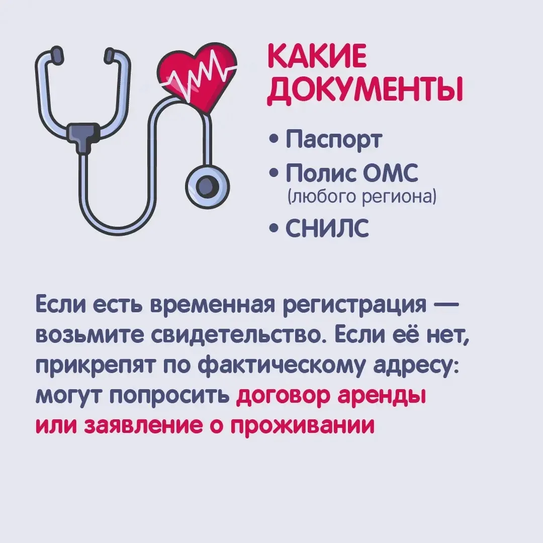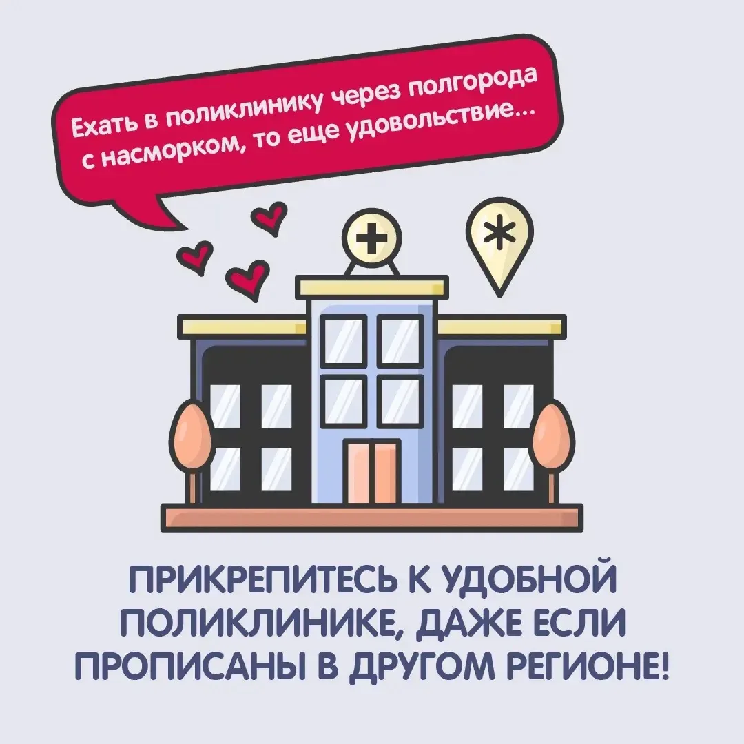 Прикрепитесь к удобной поликлинике — прописка здесь не главное. Выбирайте медучреждение рядом с домом или работой — закон это разрешает, даже если вы прописаны в другом регионе. Узнайте больше в карточках.