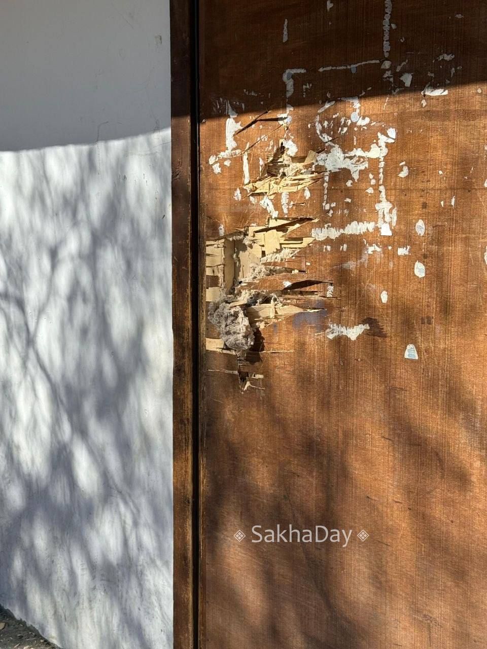Ночью 20 апреля, неизвестный расколотил дверь подъезда топором и пытался этот топор закинуть в окно первого этажа. Это самый центр, дом 6 на Чиряева. @sakhaday