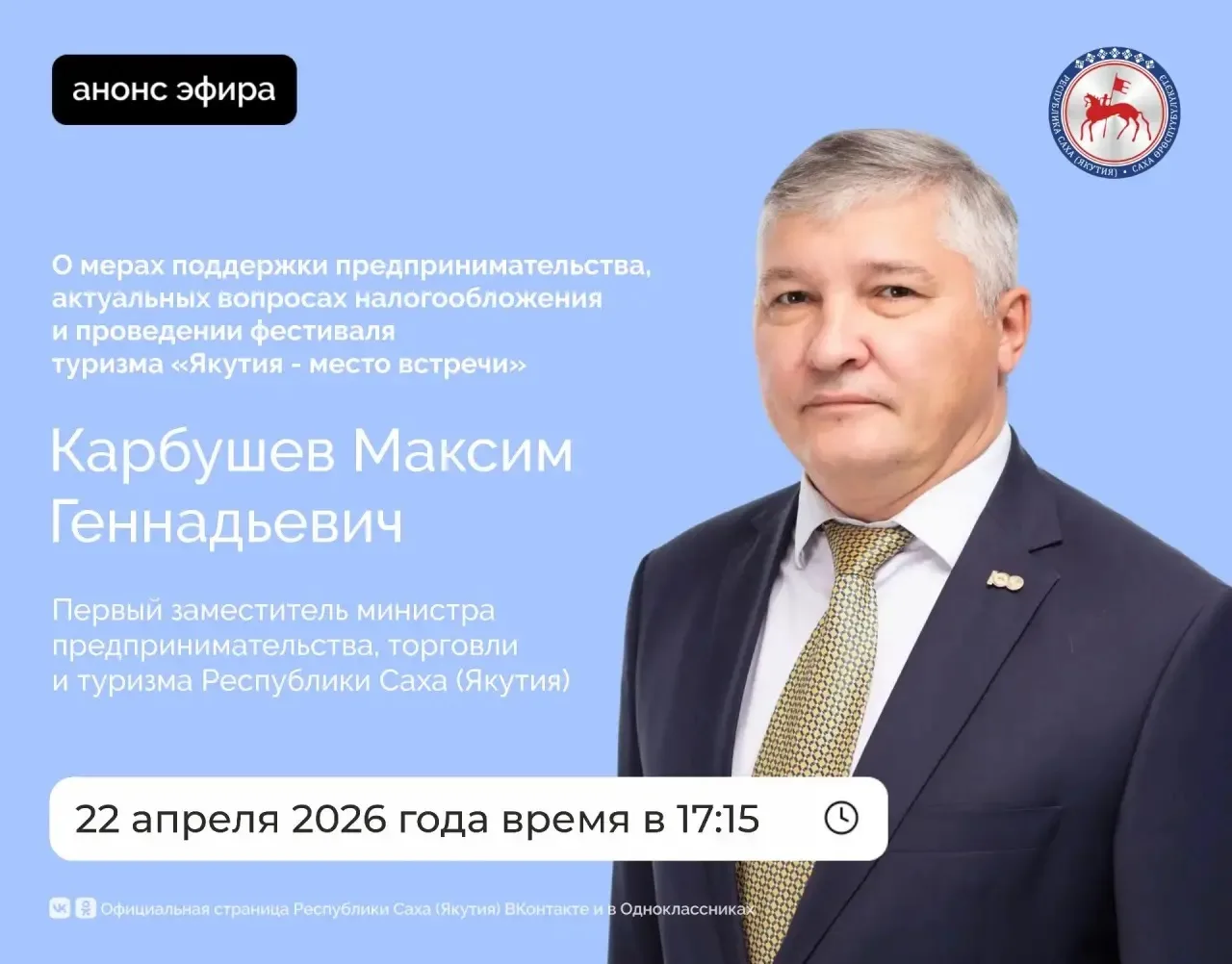 Первый заместитель министра предпринимательства, торговли и туризма Республики Саха (Якутия) Карбушев Максим Геннадьевич в среду, 22 апреля 2026 года, проведет прямой эфир на официальных страницах Администрации Главы и Правительства республики в социальных сетях «ВКонтакте» и «Одноклассники».