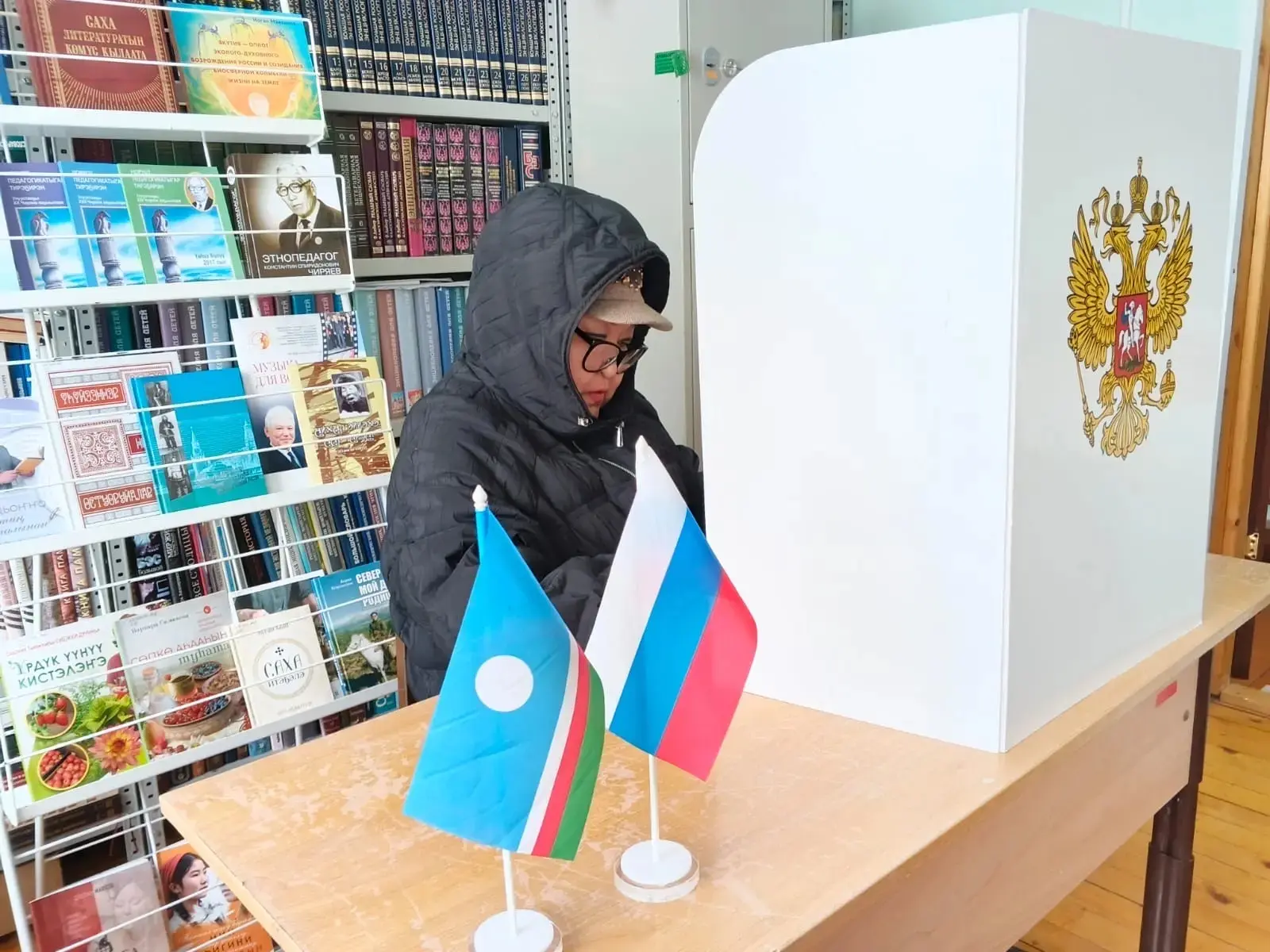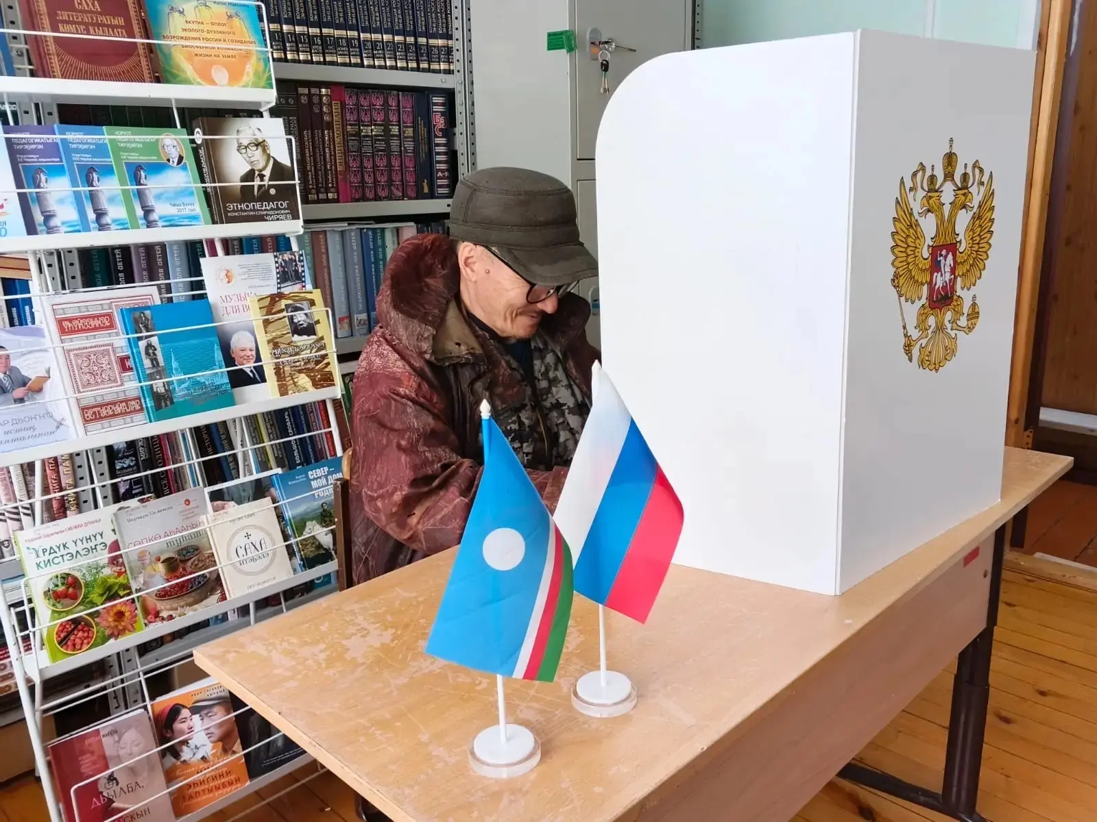 Запечатанные в конверт избирательные бюллетени хранятся в сейфе до дня голосования. Досрочное голосование в помещении УИК продолжится до 14:00 час. 25 апреля. Всего в список избирателей наслега внесены 478 человек.