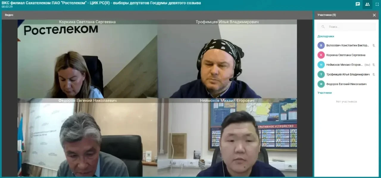 Сегодня состоялось совещание по вопросам организации видеонаблюдения в предстоящих выборах депутатов Государственной Думы 9 созыва. В совещании приняли участие председатель Центризбиркома РС(Я) Евгений Федоров, руководитель Информационного центра Центризбиркома РС(Я) Михаил Неймохов и представители ПАО «Ростелеком».