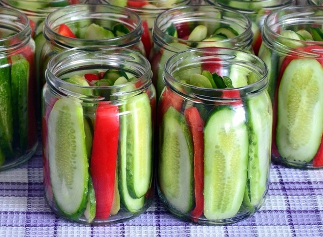 - Укладка в банки: Овощи выкладываются в предварительно стерилизованные банки слоями. Удобнее всего наклонить сосуд и укладывать ингредиенты по спирали, чередуя огурцы и перец.