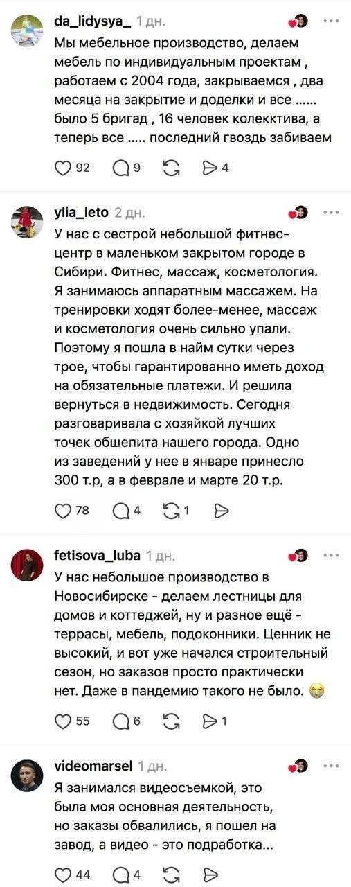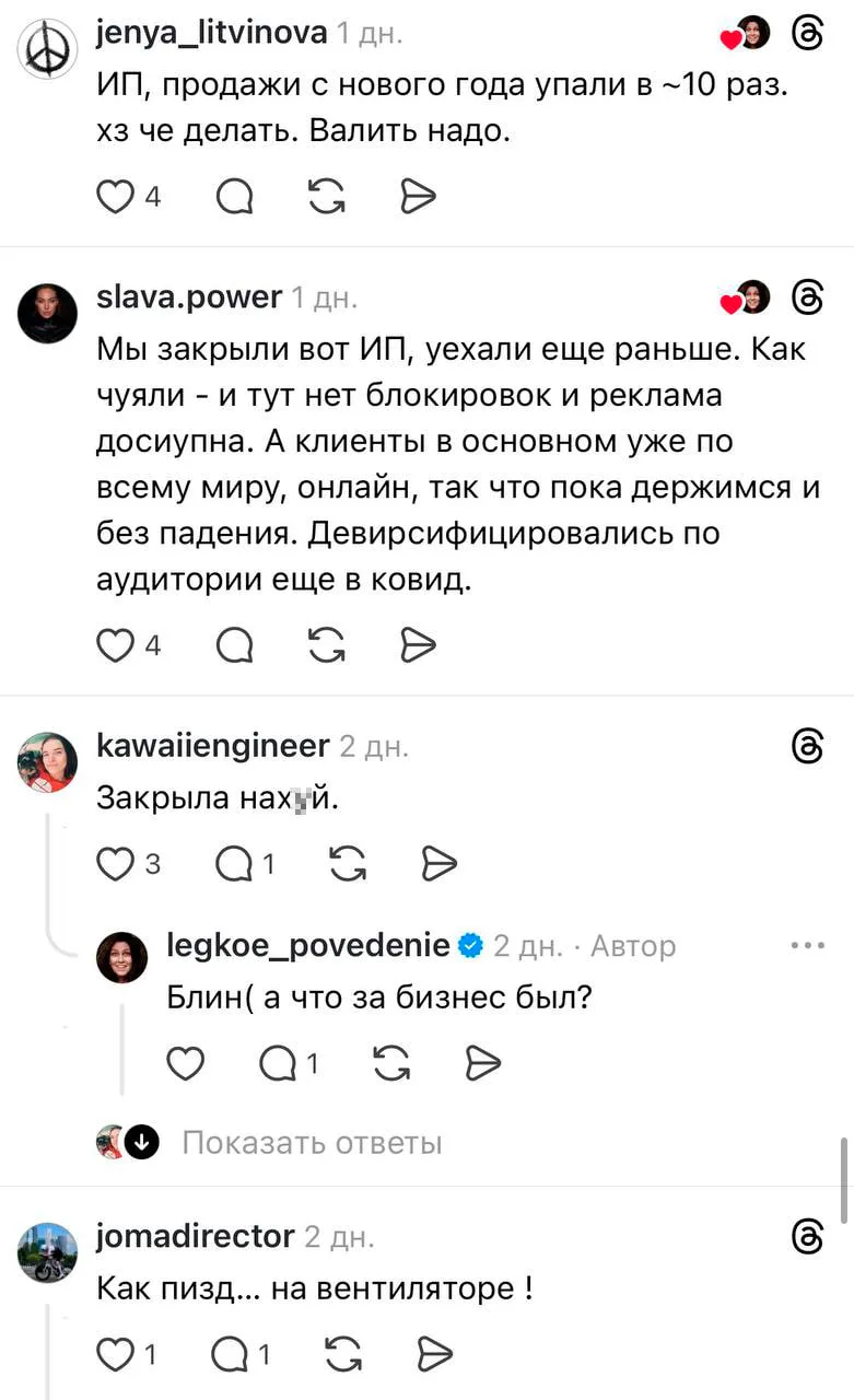 На этом фоне часть предпринимателей закрывает бизнес, часть уходит в тень, а часть рассматривает переезд, тем более что после блокировки соцсетей многие потеряли ещё и ключевой канал продаж
