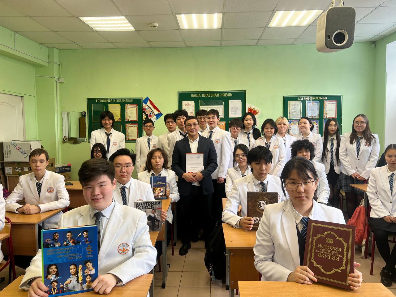 В завершение встречи Леонид Спиридонов передал в библиотеку лицея книги, посвященные 100-летию развития физкультурного движения в Якутии, а также издания о выдающихся спортсменах – про первого Олимпийского чемпиона из народа саха по вольной борьбе Романа Дмитриева, бронзового призера Олимпийских игр по боксу Георгия Балакшина и про заслуженного тренера РСФСР по вольной борьбе Будимира Яковлева.
